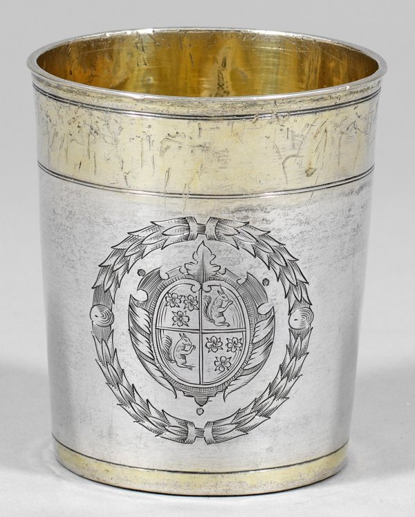 Silber, teilw. vergoldet. Nahezu zylindrische Form mit profiliertem, geringfügig ausgestelltem Lippenrand. Glatte Wandung mit breiter Randzone, abgesetzt durch schmale Profillinien. Schauseitig graviertes Wappen im Oval, gerahmt von Lorbeerblattkranz. Auf Bodenunterseite gravierte Initialen "T. v. D.". Innen vergoldet. Gest., Tremolierstrich, Beschauzeichen, Meister Jeremias II Flicker (wird Meister 1610). Gew. ca. 115 g. H. 7,5 cm.