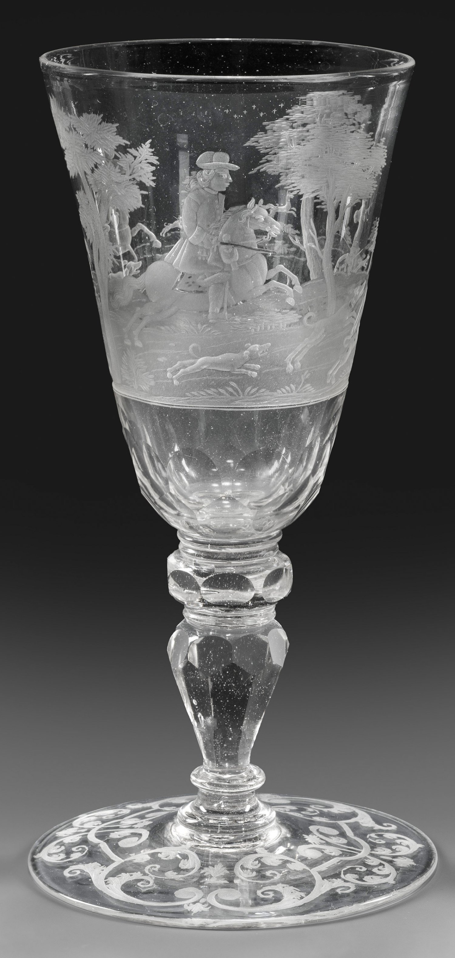 Farbloses Glas, partiell geschliffen. Flacher Scheibenfuß, Balusterschaft und Ansatz der konischen Kuppa facettiert bzw. wabenfacettiert. Umlaufend fein geschnittene, teilw. geblänkte Szene mit zwei berittenen Jägern und ihrer Hundemeute bei der Hirschjagd in baumbestandener Landschaft; auf dem Fuß annähernd flächendeckendes Bandelwerk. H. 19,8 cm.