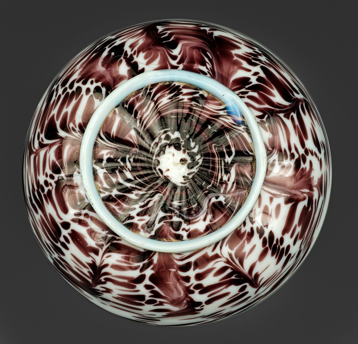 Runde, leicht gemuldete Form mit aufgelegtem Standring. Teilw. bläulich opalisierendes Milchglas mit Abriss, die Außenwandung mit federartig marmoriertem Dekor aus manganfarbenen Glaskröseln, längsoptisch in ein Rippenmodel geblasen. D. 13 cm.