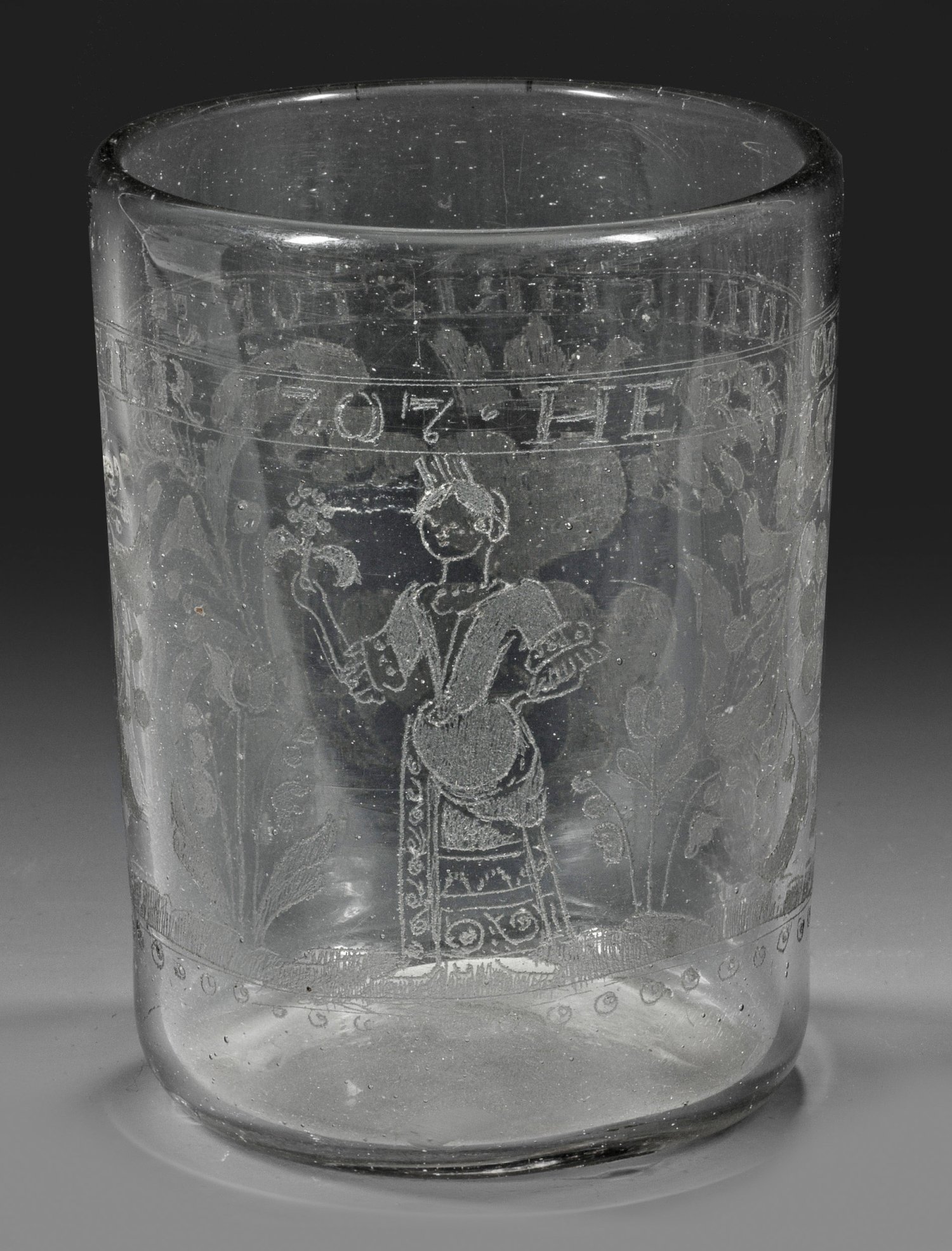 Zylindrisch. Leicht graustichiges Glas mit Abriss. Mit einem Diamant gerissene Freundschafts- bzw. Liebesallegorien. Zwischen Tulpen- und Maiglöckchenzweigen stehende Dame in Zeittracht mit Blume in der Hand, rücks. ein von Blütenzweigen flankiertes, bekröntes Motiv aus drei Herzen und einem Anhängeschloss an Kette. Unterhalb des Lippenrandes umlaufende Inschrift mit Dat. ''HERR JOHANN CHRISTOF STETNER 1707''. Kugelfüße beschliffen. H. 11,3 cm.