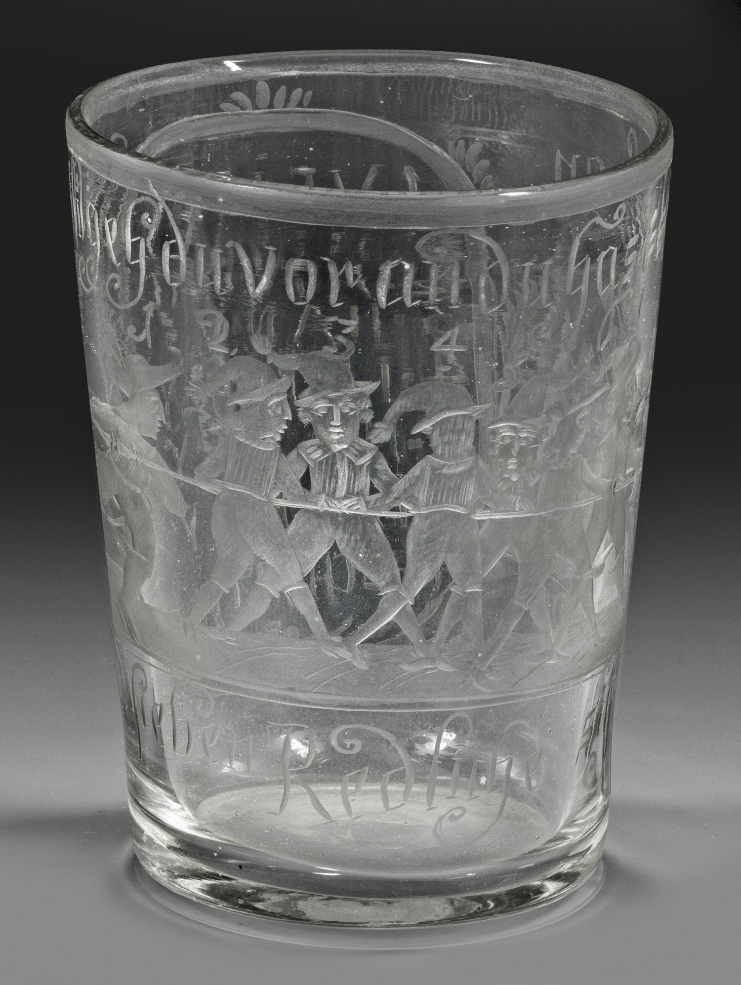 Farbloses, leicht graustichiges Glas. Annähernd zylindrische Form mit Abriss im Boden. Mattgeschnittene Darstellung der durchnummerierten Sieben Schwaben mit Speer vor einem Hasen, inschriftlich bez. ''die sieben Redliche schwaben'' sowie ''Veytli geh du voran du hast stüfeln an''. Rücks. numerisch aufgelistete Namen. H. 11,8 cm.