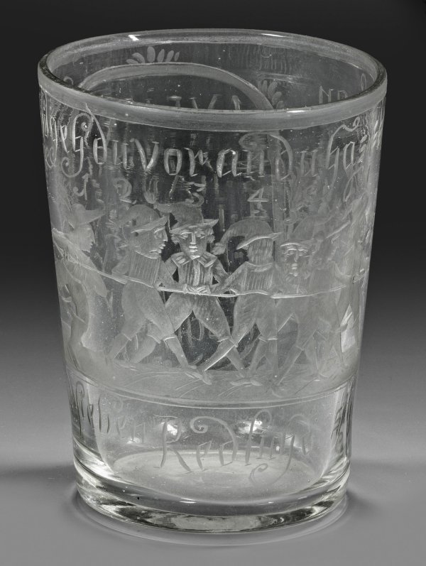 A South German engraved glass beaker depicting The Seven Swabians.