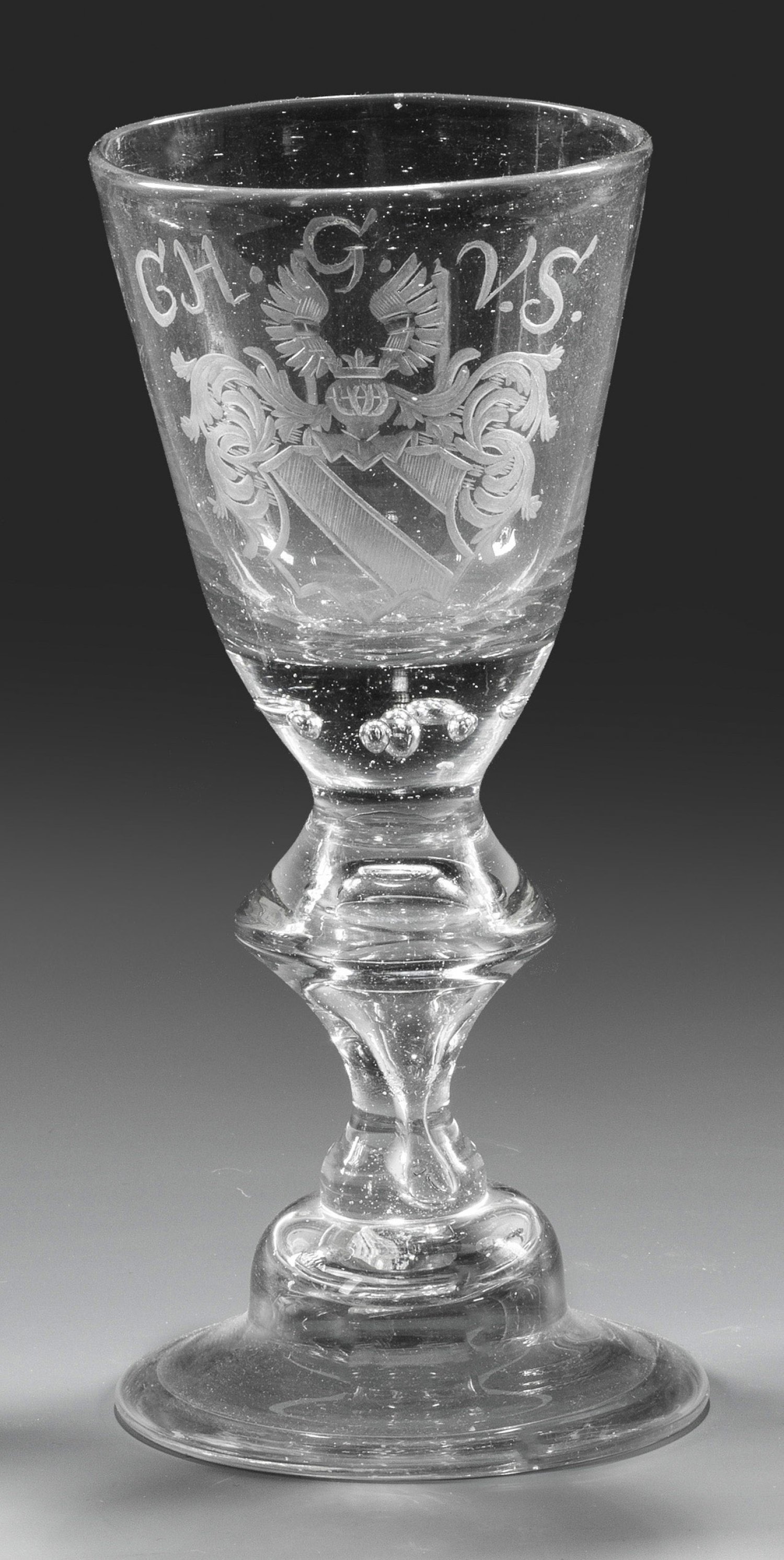 Farbloses, leicht graustichiges Glas. Glockenfuß mit umgeschlagenem Rand und Abriss im Boden, der Hohlbalusterschaft mit großer, eingestochener Luftblase, im eingezogenen Ansatz der konischen Kuppa sieben kleine, eingestochene Luftblasen. Schauseitig mattgeschnittener, teilw. geblänkter Dekor aus einem Wappen mit Helmzier und Monogramm "CH. G. V. S.". H. 16 cm.