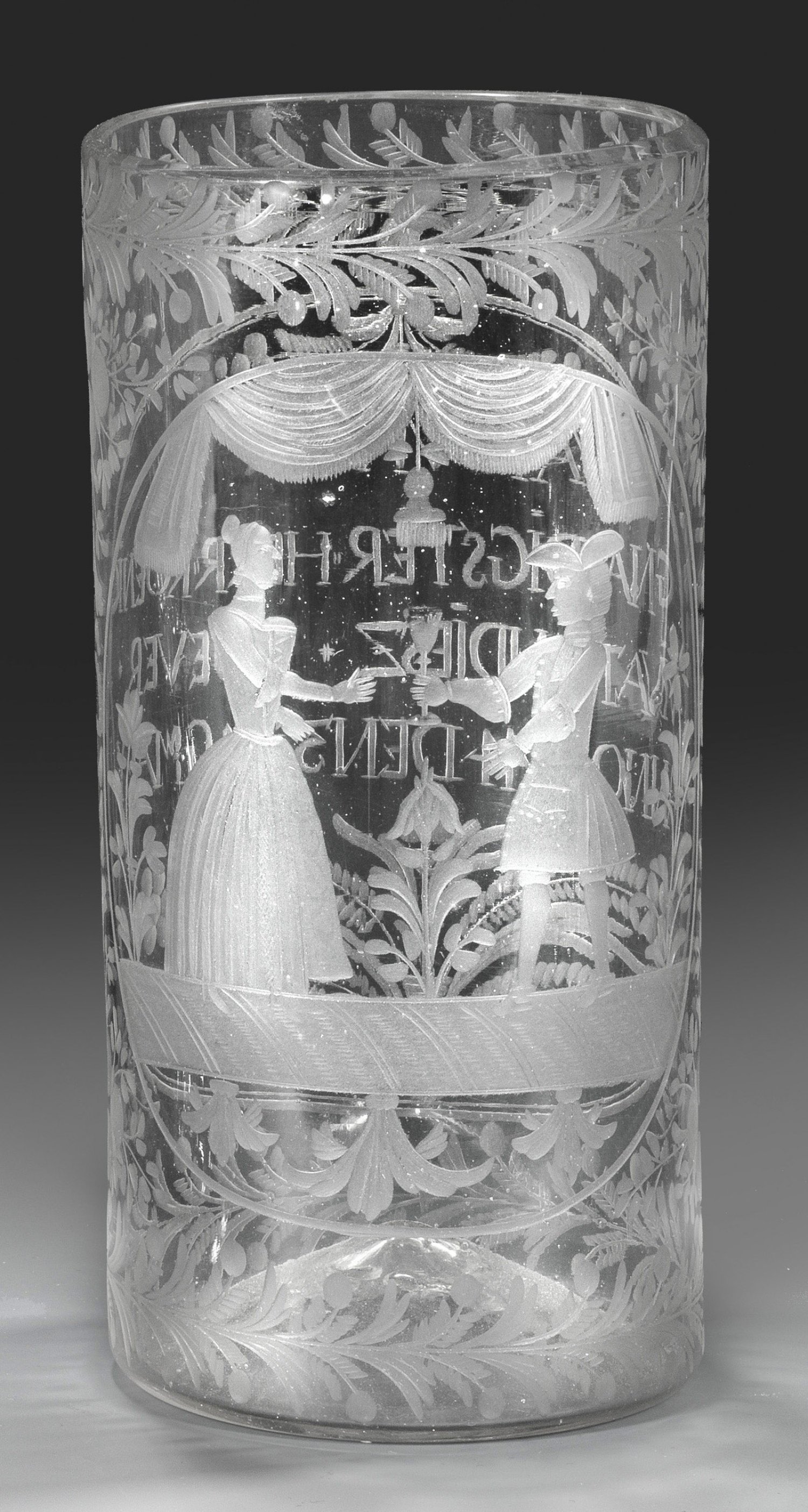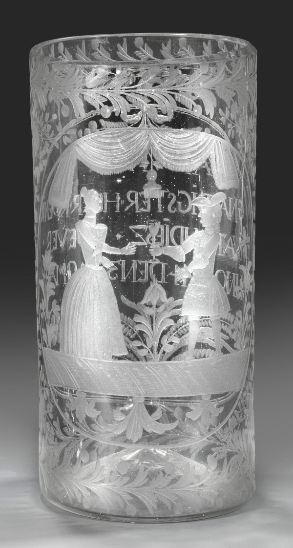 Farbloses Glas. Sog. Potsdamer Stange. Zylindrisch, konisch hochgestochener Boden mit Abriss. Annähernd flächendeckender, mattgeschnittener Dekor aus zwei großen, hochovalen Medaillons, auf der einen Seite das Barock-Paar in höfischer Tracht mit einem der Dame zuprostendem Herrn unter einem Baldachin, auf der anderen Seite Inschrift "VIVAT UNSER GNAEDIGSTER HERR KOENIG (/) VIVAT ANDIESZ HOEVER ANNO 1744 DEN 3 TAG MAEY". Flankierend florale Motive, zum Stand und Lippenrand umlaufender Zweigfries. H. 16,5 cm.
