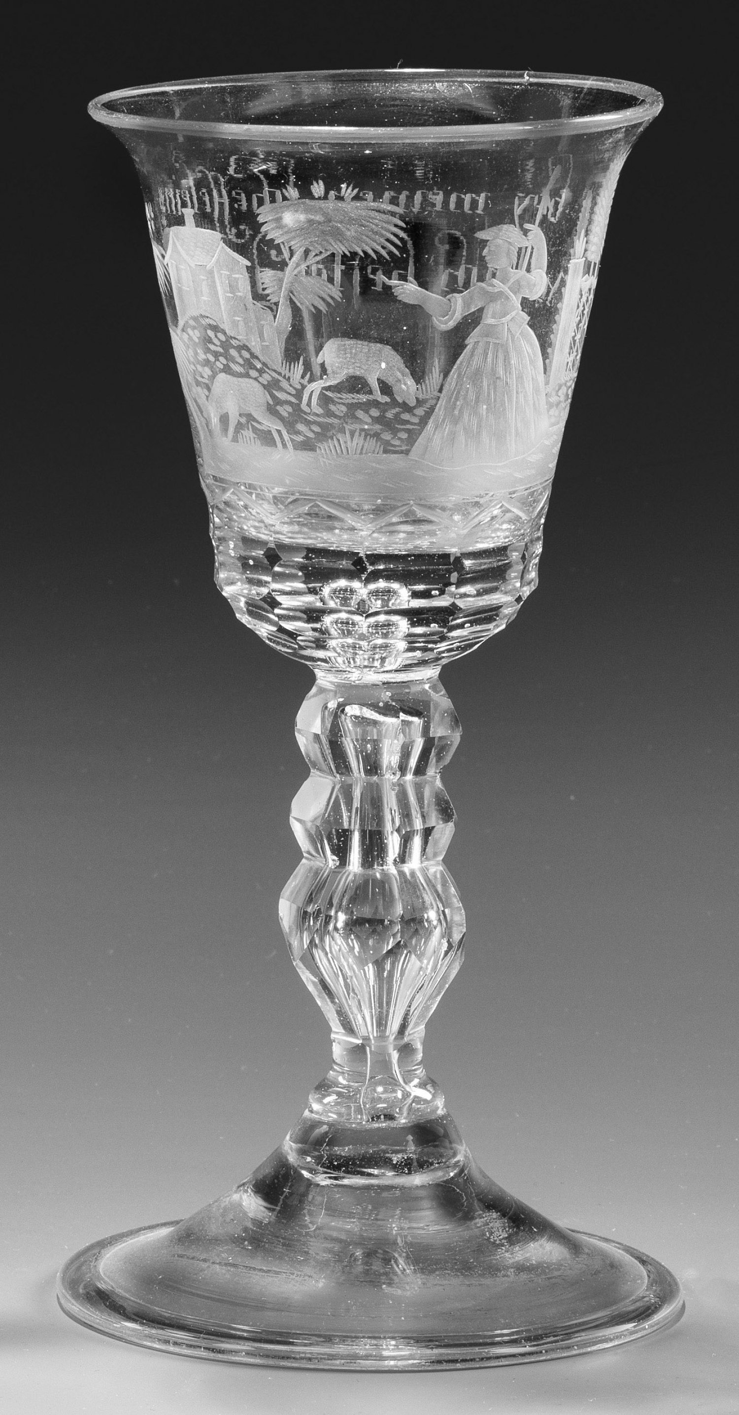 Farbloses Glas. Glockenförmige Kuppa, Ansatz und gegliederter Balusterschaft mit eingestochenen Luftblasen, wabenfacettiert. Ansteigender Fuß mit umgeschlagenem Rand. Auf der Kuppa matt geschnittener Dekor aus einer Schäferin mit zwei grasenden Schafen in Landschaft, rücks. "bey meinen Scheffelein wil ich bestendig sein". H. 16,4 cm.