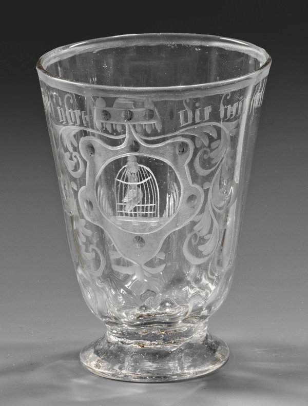 A Bohemian glass beaker with engraved birdcage as allegory of freedom.