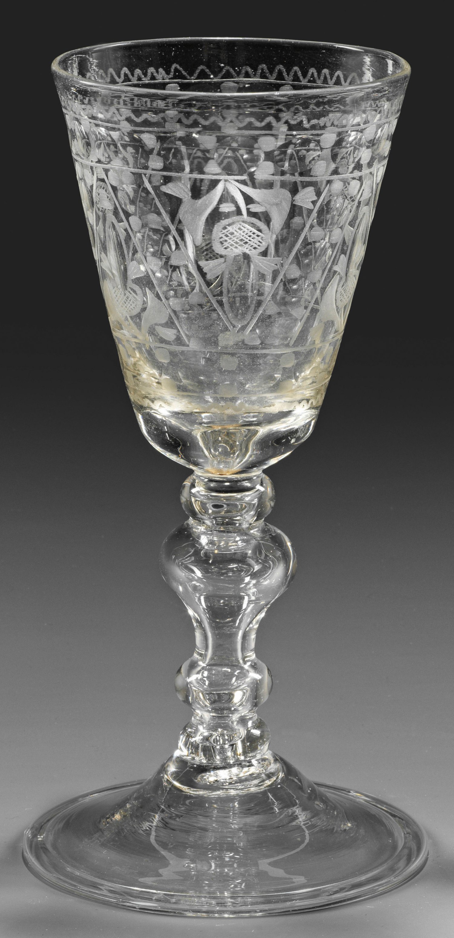 Farbloses Glas. Ansteigender Scheibenfuß mit umgeschlagenem Rand, reich gegliederter Hohlbalusterschaft, auf der konischen Kuppa mattgeschnittener und geschliffener, ornamentaler Dekor aus Dreiecken mit Eicheln. H. 18,7 cm.