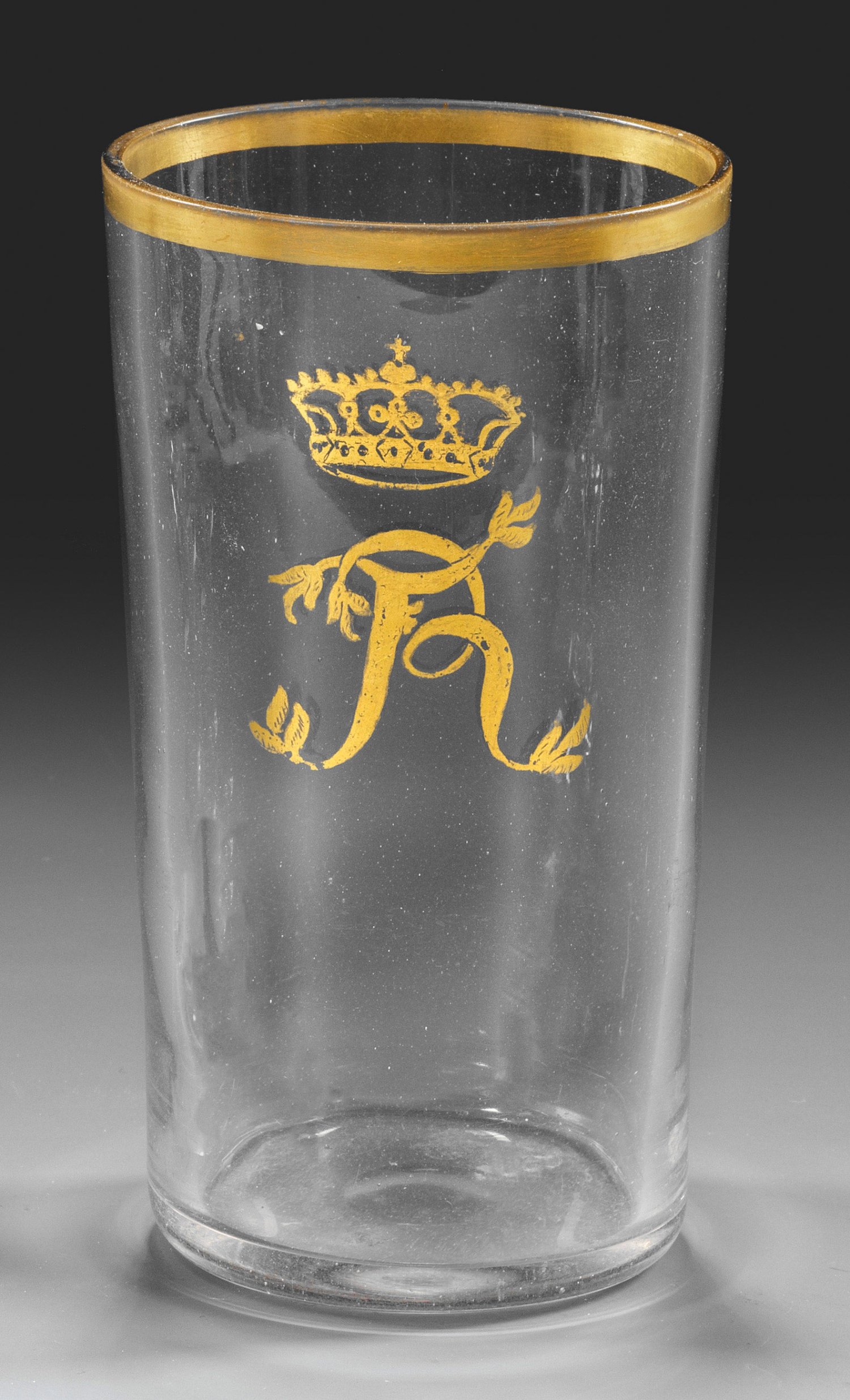 Farbloses Glas. Zylindrisch, im Boden ausgeschliffener Abriss. Schauseitig ligiertes Monogramm "FR" (=Fridericus Rex) in radierter Goldmalerei für König Friedrich II. von Preußen, der Lippenrand vergoldet. H. 12 cm.