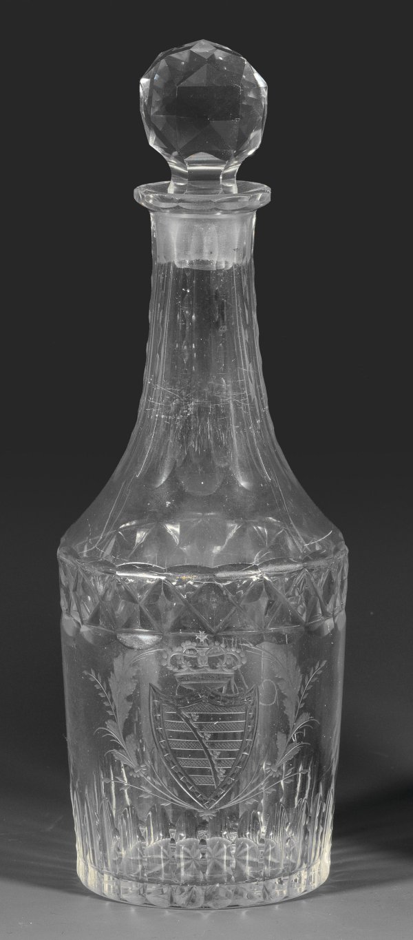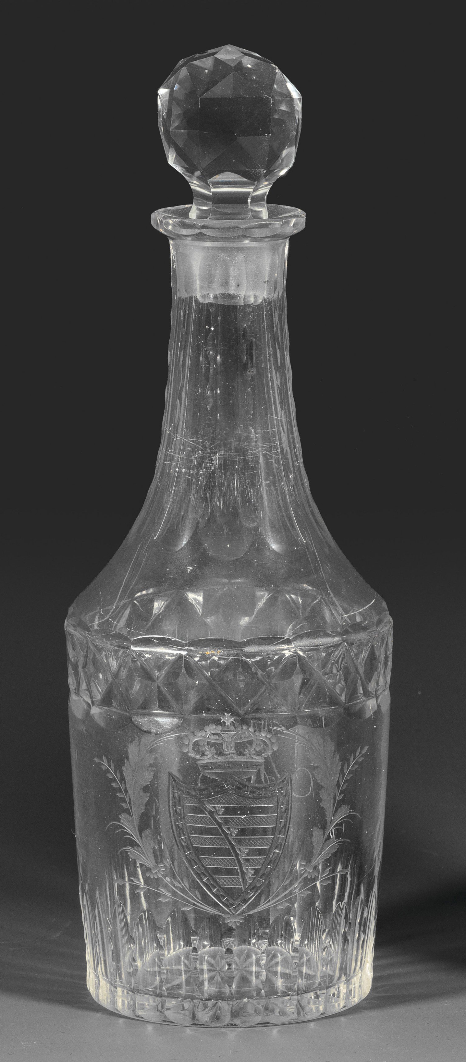 Farbloses Glas, partiell Schliffdekor. Leicht konischer Korpus, abgesetzte, schräge, in den Hals einschwingende Schulter, wabenfacettierter, kugeliger Stöpsel. Sehr fein geschnittener, teilw. geblänkter Dekor. Schauseitig das sächsische Wappenschild mit Königskrone seit 1806, flankiert von Zweigen; rücks. Ligatur-Monogramm "MA" mit Königskrone, wohl für Prinzessin Maria Augusta von Sachsen (1782 - 1863), einziges Kind König Friedrich August I. von Sachsen. Ges.-H. 21,7 cm.