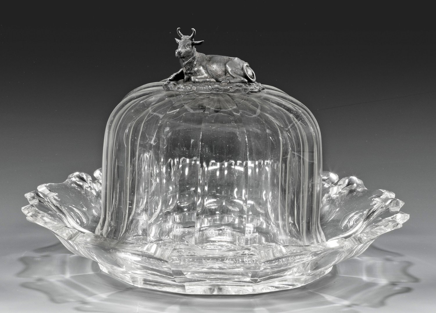 Farbloses Glas, reich geschliffen. Runder Unterteller mit vielpassig geschweiftem Rand und Bodenstern, der Sturz polygonal facettiert, der silberne, plastische Knauf in Gestalt einer liegenden Kuh. Unterteller best.; H. 16 cm; D. 26,5 cm.