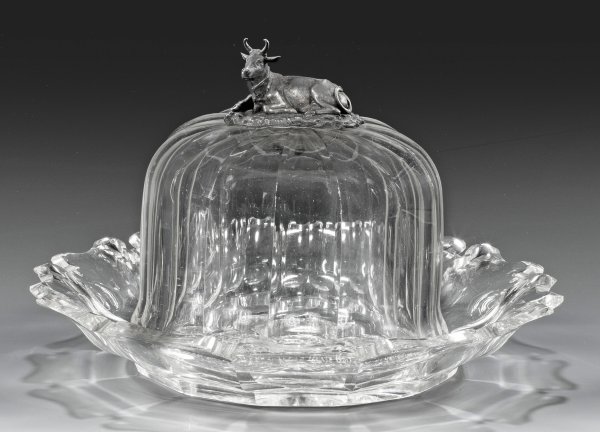 A Dutch silver-mounted cut glass cheese dish. The cheese dome with silver handle in shape of a cow. Chips to the saucer.