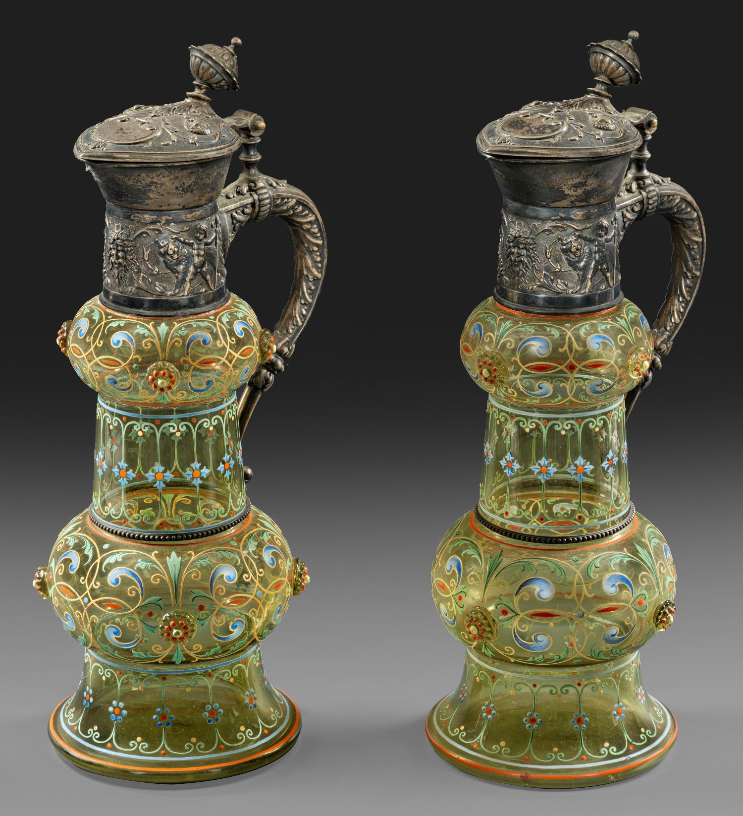 Gegliederte Form und Dekor im Renaissance-Stil. Grünliches Glas mit Beerennuppenauflagen. Reicher, polychromer, opaker Emaildekor aus Ornamenten mit Blatt- bzw. Akanthusranken und Blütenmotiven. Henkel, Hals und Deckel aus Silber mit opulentem, feinem Reliefdekor aus Bacchusknaben mit Löwen sowie Ornamenten. Modell-Nr. 6672. Gest. 800, Herstellerzeichen u. Vertriebstempel des Bremer Juweliers Wilkens & Danger. H. 33,5 cm.