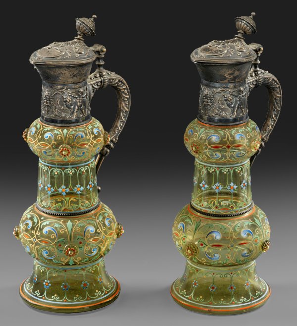 Lot 691: Paar Historismus-Schenkkannen mit Silbermontierung