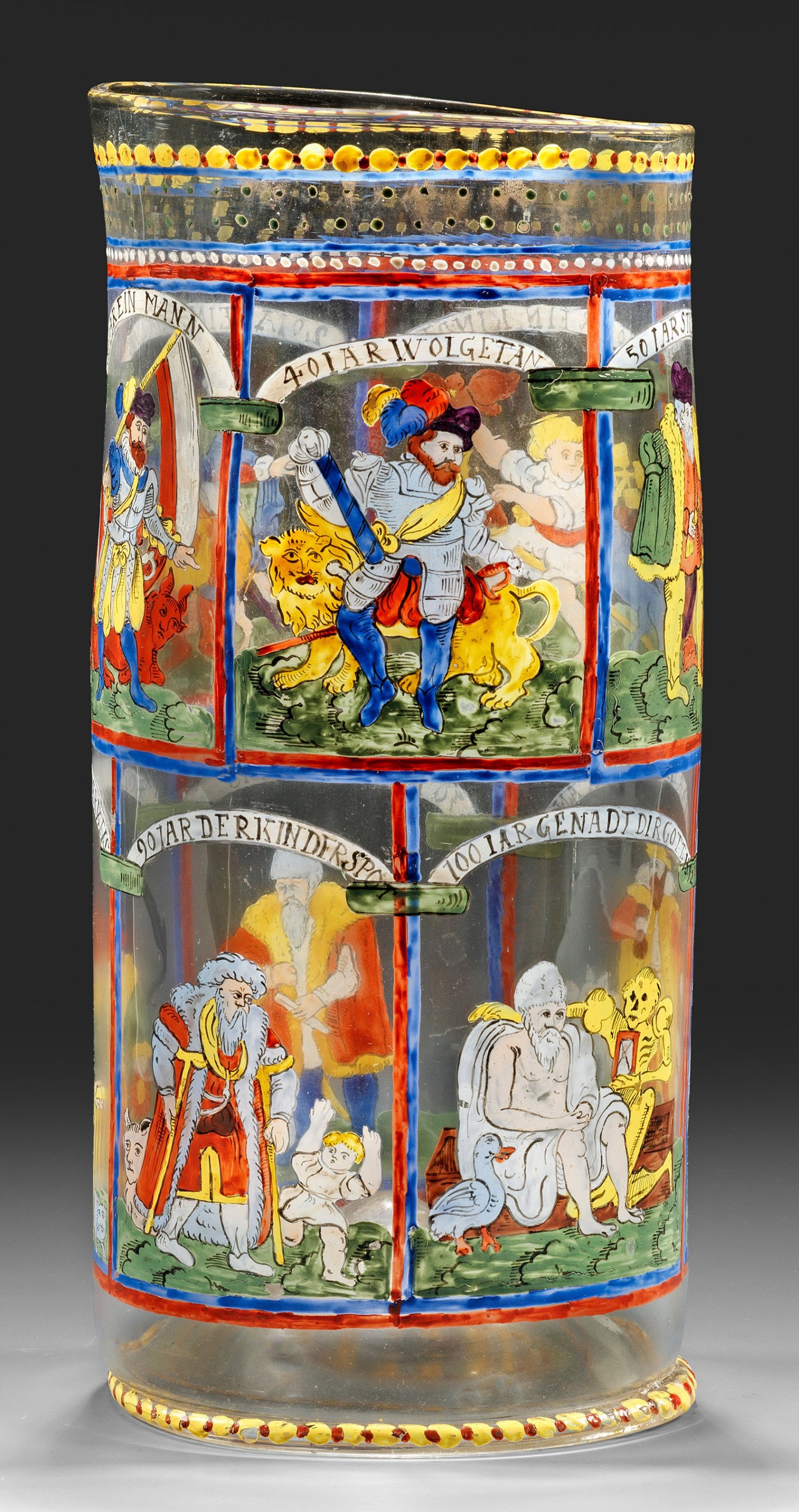 Farbloses Glas. Annähernd zylindrische Walzenform mit Fußwulst, konisch hochgestochener Boden mit Abriss. Polychromer Emaildekor aus 10 Bildfeldern mit Darstellungen der Lebensalter in 10-Jahrens-Schritten, jeweils in Versalien inschriftlich bez.: "10 Jar ein Kindt", "20 Jar ein Jungling", "30 Jar ein Mann", "40 Jar wolgetan", "50 Jar stille stan", "60 Jar geht’s Alter an", "70 Jar ein Greis", "80 Jar nimmerweis", "90 Jar der Kinder Spot", "100 Jahr Genad dir Gott. 1592". Etikett der Sammlung U. Friedleben, Hannover. H. 31,2 cm.