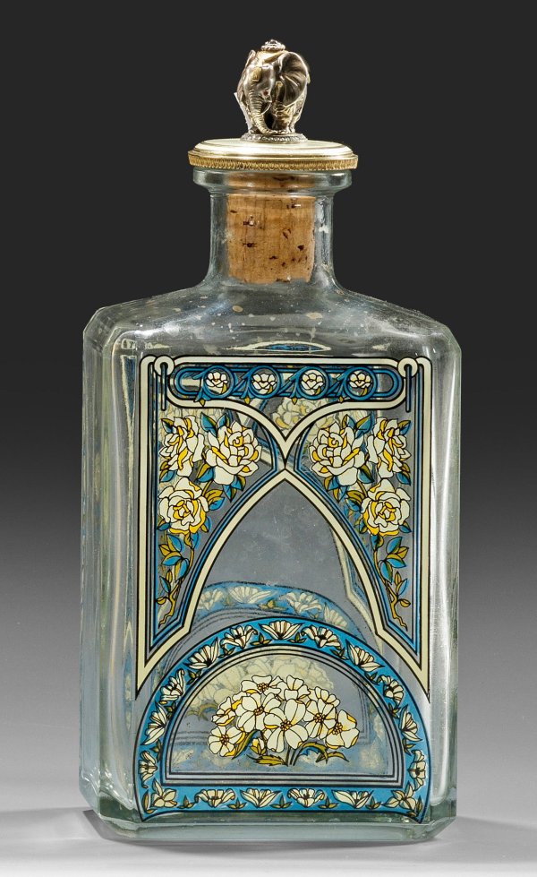 Farbloses Glas, teilw. vergoldetes Silber. Rechteckiger Flaschenkorpus mit abgeschrägten Ecken. Die Schauseiten mit polychromen Zierornamenten und Rosendekor verziert. Der Stopfen mit rundem Deckel, obenauf elfenbeinfarben emailliert und wellenförmig guillochiert sowie außen von reliefiertem Blattkranz umzogen. Als Bekrönung die vollplastische Darstellung eines Elefanten mit Farbsteincabochons als Augen über Rosette, ausgefasst mit Diamantrosen. Gest. 88. H. 22,5 cm. 10 cm x 7 cm.