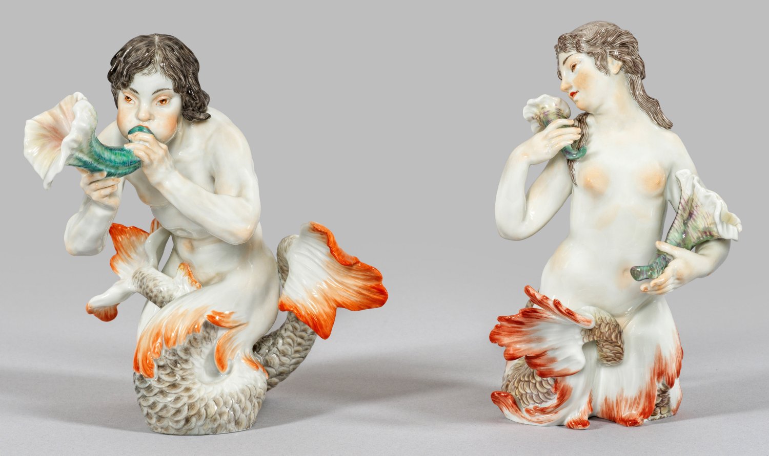 Die vollplastische Darstellung von Nymphe und Triton, auf ihren eingerollten, geschuppten und fein reliefierten Fischschwänzen mit blättrigen Flossen stehend. Während Triton leicht nach vorne gebeugt in ein Muschelhorn bläst, trägt die Nymphe ihre beiden vegetabilen Hörner in ihren Händen. Feine polychrome Malerei. Entw. Johann Joachim Kaendler, um 1740. Modell-Nr. 70502 und. 70503. Schwertermarke. H. 16 cm.