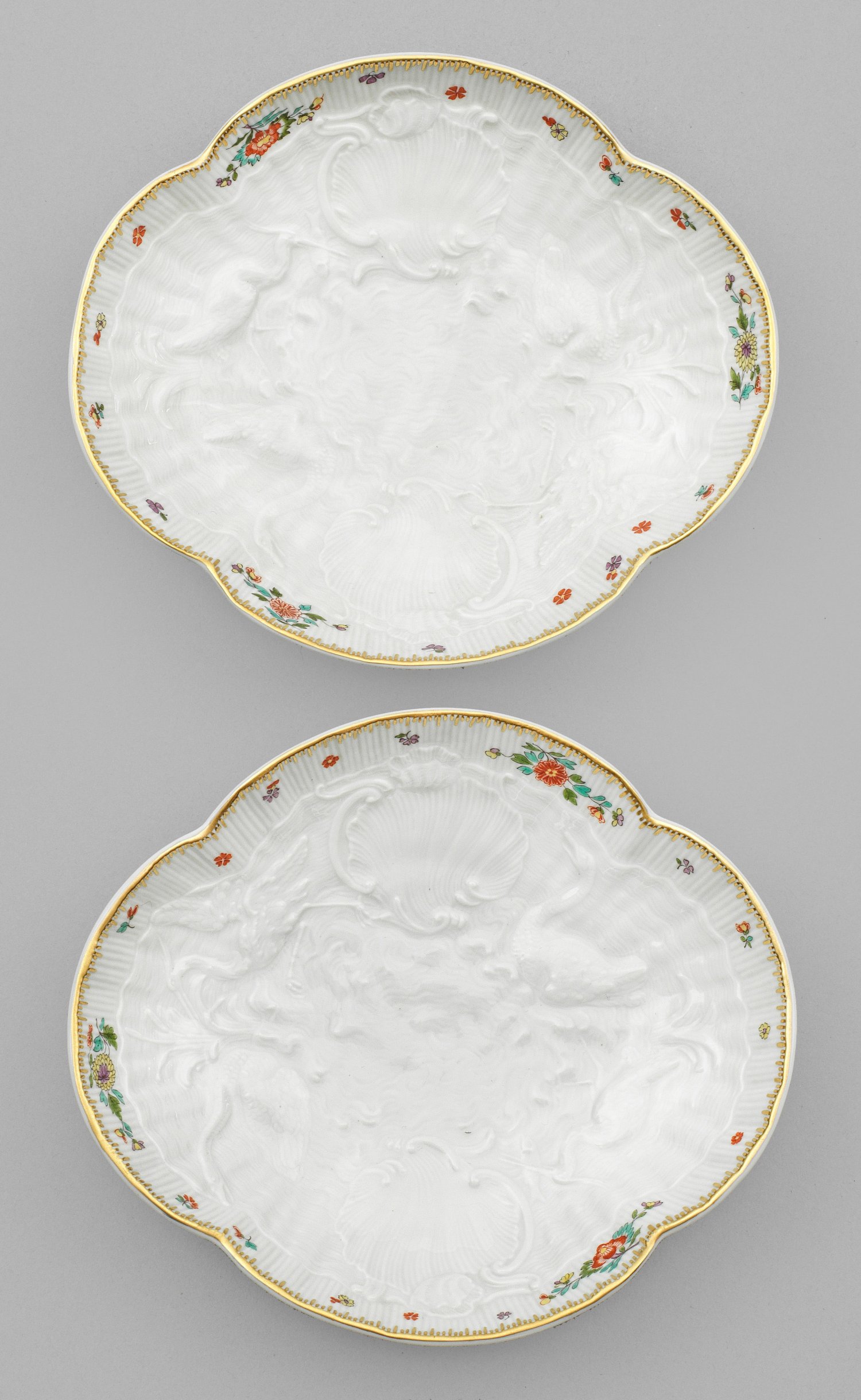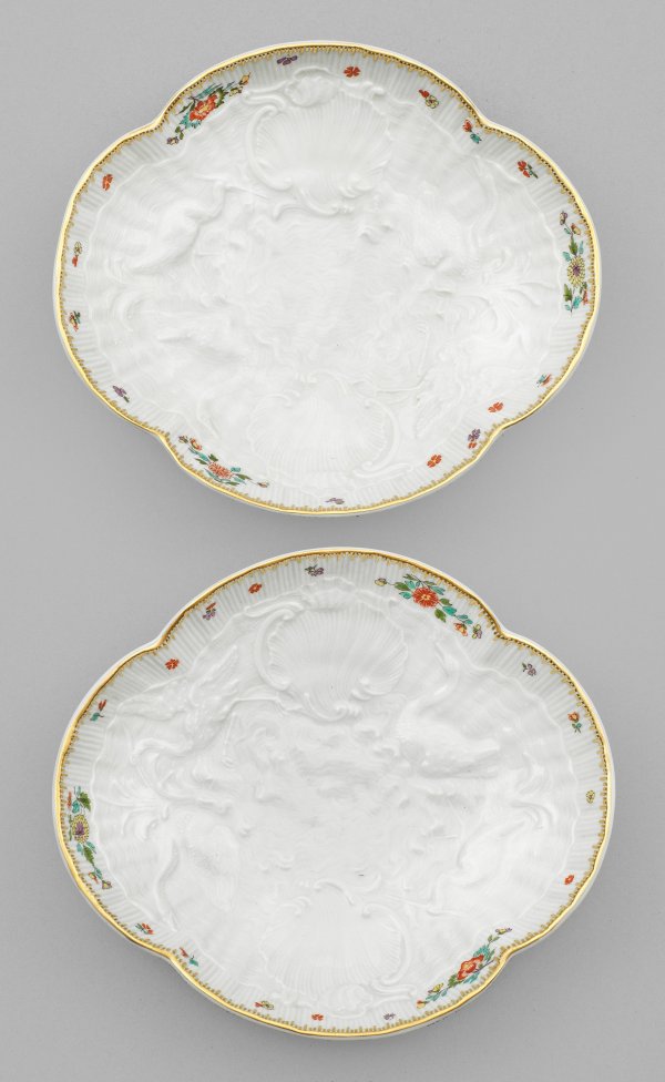 Vierpassige, leicht gemuldete Form. Im Spiegel feiner muschelartiger Reliefdekor mit zwei Schwänen und zwei Fischreihern im Schilf. Polychromer Indianischer Blütendekor mit gekämmter Goldkante. Entw. Johann Joachim Kaendler und Johann Friedrich Eberlein. Schwertermarke. 14,5 cm x 13 cm.