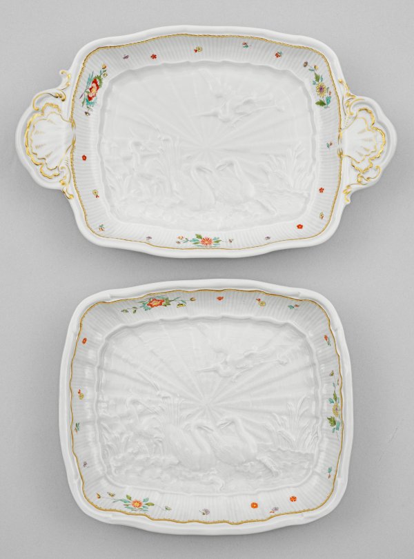 Rechteckige, gemuldete Form, teilw. mit seitlichen muschelförmigen Handhaben. Feiner Reliefdekor aus zwei einander zugeneigten Schwänen sowie fliegendem und zwischen hohem Schilf stehendem Reiher im Spiegel. Auf dem gerippten, ansteigenden Rand Indianischer Blütendekor in polychromer Malerei. Gekämmte Goldkante und -staffage. Entw. Johann Joachim Kaendler und Johann Friedrich Eberlein. Schwertermarke. L. 25,5 cm - 33,5 cm.