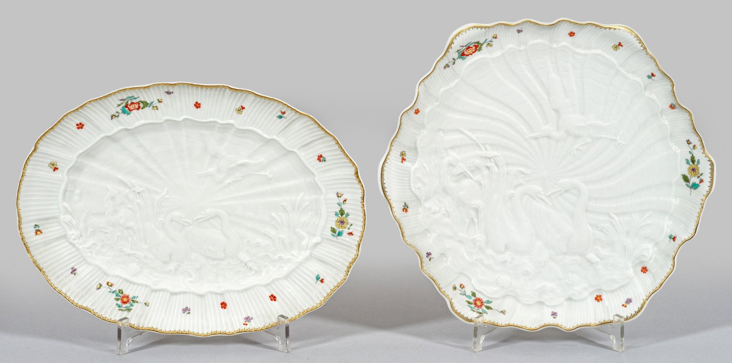 Ovale bzw. sechseckige Grundform. Feiner, muschelförmiger Reliefdekor aus dem Schwanenservice (Schwanendessin). Im Spiegel zwei auf dem Wasser schwimmende, einander zugewandte Schwäne zwischen hohem Schilf sowie stehender und fliegender Reiher. Auf Fahne asiatische Blütenzweige und gestreute Blumen in Kakiemon-Manier. Gekämmter Goldrand. Schwertermarke. L. 30 cm, D. 28 cm.