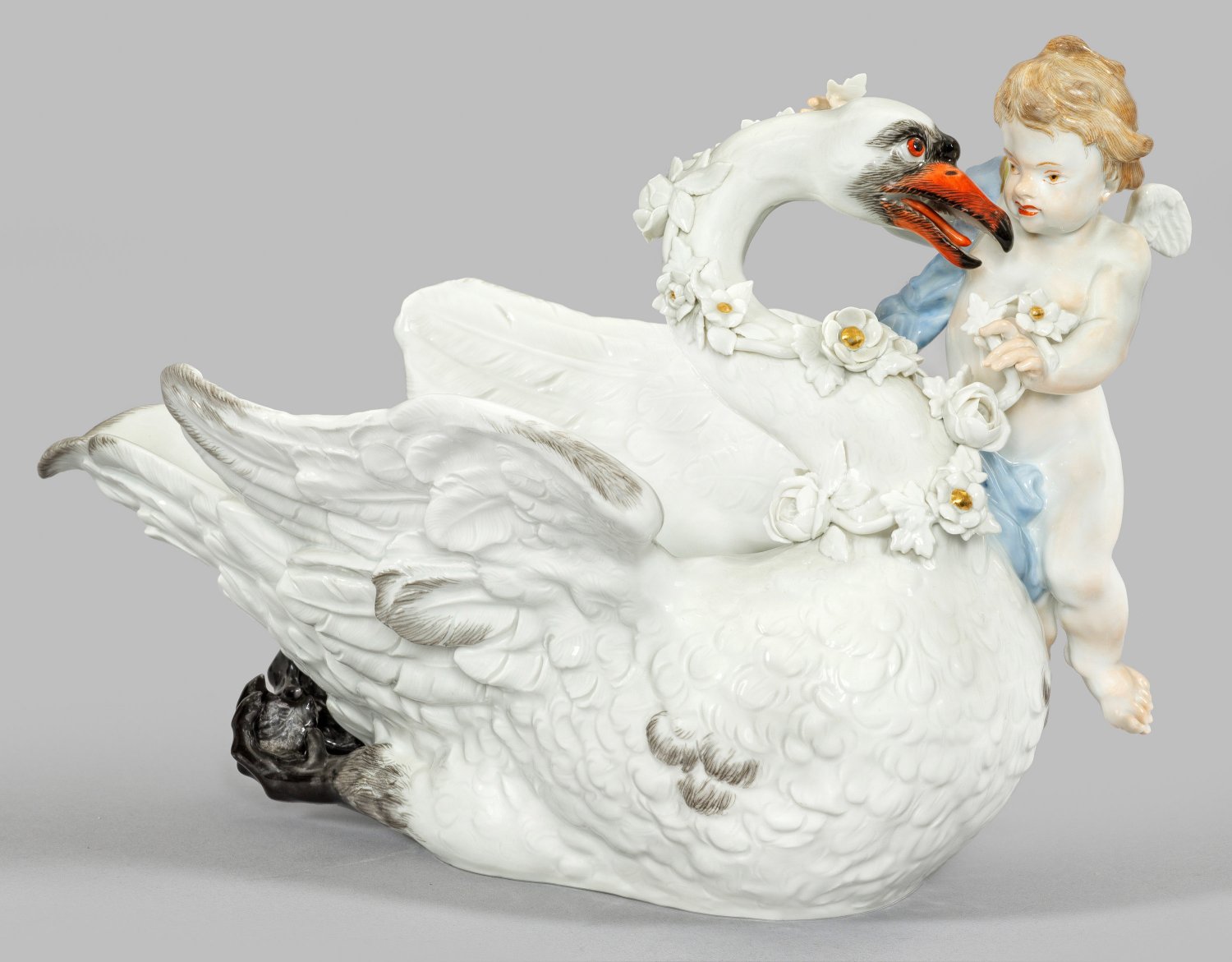 Ursprünglich für das Schwanenservice gestaltet. Die vollplastische Darstellung eines Schwans mit fein reliefiertem Gefieder, einen sich um den Hals windenden, von einem Putto dekorierten Blumenkranz mit sparsam goldakzentuierten Reliefblüten, tragend. Dezente polychrome Malerei. Entw. Johann Friedrich Eberlein, 1738. Form-Nr. 05225. Schwertermarke. H. 19 cm. L. 27 cm.