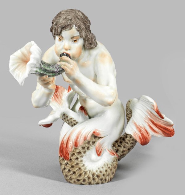 Die vollplastische Darstellung von Triton, auf seinem eingerollten, geschuppten und fein reliefierten Fischschwanz mit blättrigen Flossen stehend und ein vegetabiles Horn in Händen haltend. Feine polychrome Malerei. Entw. Johann Joachim Kaendler, um 1740. Modell-Nr. 70503. Schwertermarke. H. 16 cm.