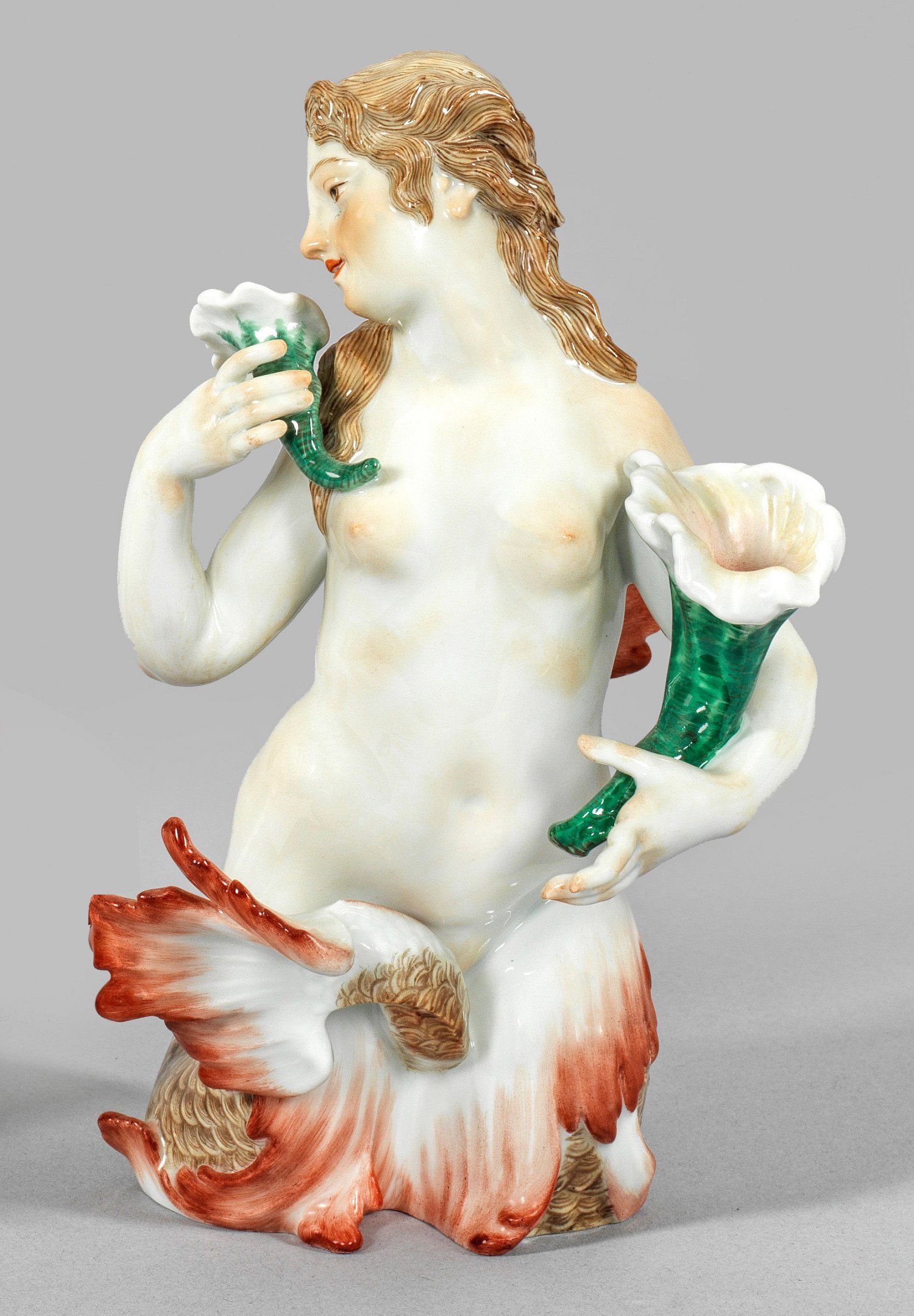 Die vollplastische Darstellung einer Nymphe, auf ihrem eingerollten, geschuppten und fein reliefierten Fischschwanz mit blättrigen Flossen stehend und ihre beiden vegetabilen Hörner in den Händen haltend. Feine polychrome Malerei. Entw. Johann Joachim Kaendler, um 1740. Modell-Nr. 70502. Schwertermarke. H. 16 cm.