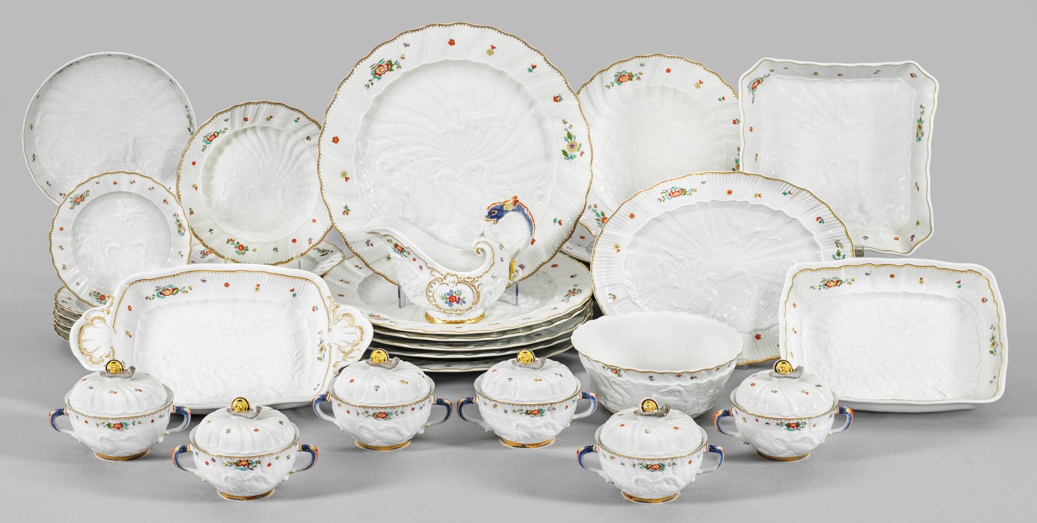 für sechs Personen. 37-tlg.; 6 Speiseteller, 6 Platzteller, 6 Dessertteller, 6 kleine Teller, 6 Suppentassen mit Deckeln, eine Sauciere, eine kleine Platte, eine gemuldete Schale, eine flache Schale, eine flache rechteckige Schale, eine hohe Schale und eine Beilagenschale. Plastischer Knauf und figürlicher Henkel in Gestalt einer Schnecke bzw. eines Delphins. Feiner, muschelartiger Reliefdekor mit zwei einander zugeneigten Schwänen, einem zwischen hohem Schilf stehendem Reiher, darüber fliegender Fischreiher. Farbenprächtiger Indianischer Blütendekor in polychromer Malerei. Gekämmte Goldkante und -staffage. Entw. Johann Joachim Kaendler und Johann Friedrich Eberlein. Schwertermarke. Teller D. bis 31,5 cm. Platten L. bis 33 cm