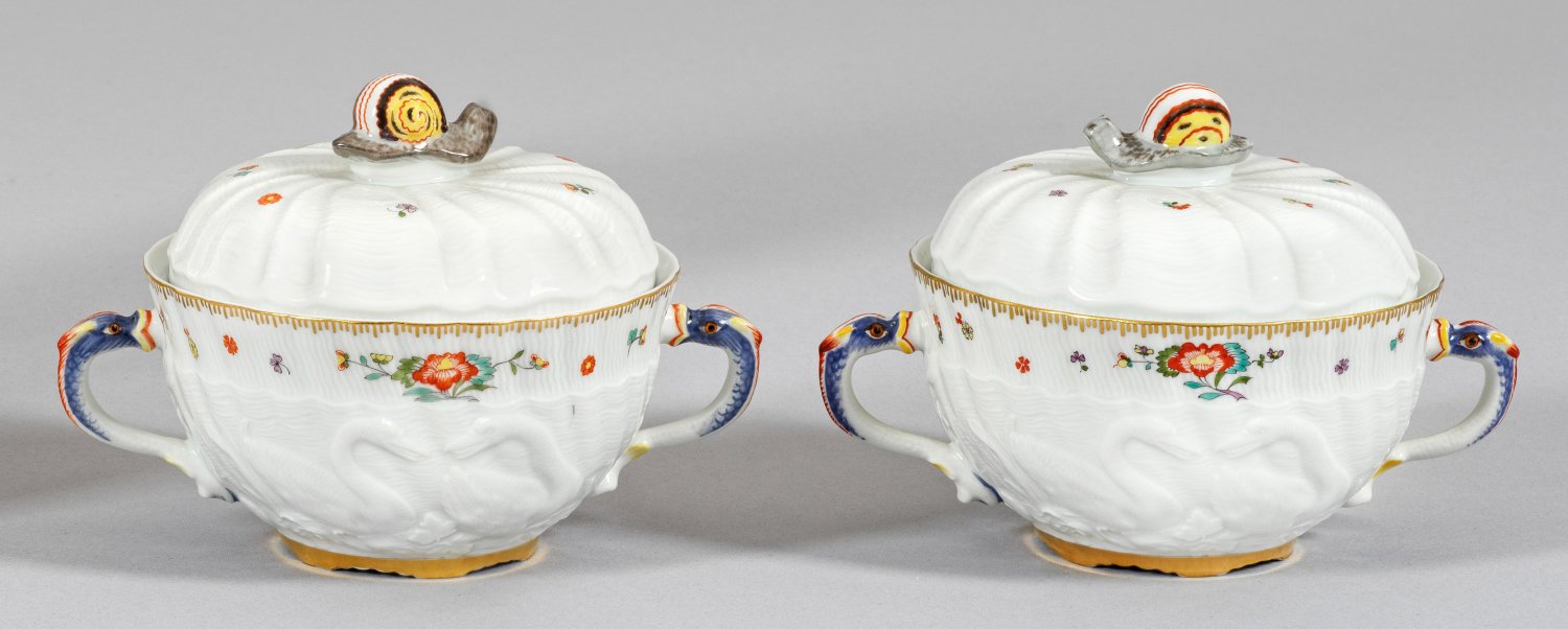 Lot 734: Zwei Suppendeckeltassen mit Schwanenservice-Dekor