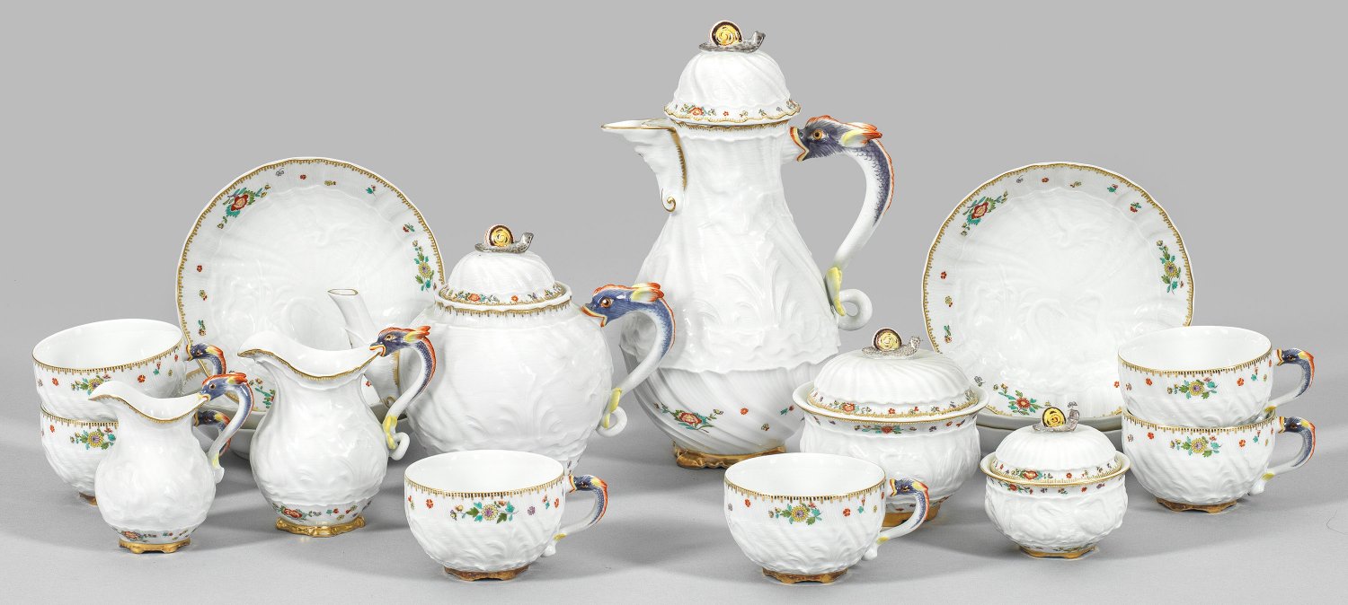 für sechs Personen. 12-tlg.; Kaffeekanne, Teekanne, zwei Sahnegießer, zwei Zuckerdosen, sechs Tassen mit Untertassen. Figürlicher Henkel und Knauf in Gestalt eines Delfins bzw. einer Schnecke. Feiner Reliefdekor aus zwei einander zugeneigten Schwänen, fliegendem und zwischen hohem Schilf stehendem Reiher. Polychrome Indianische Blumenzweige mit gekämmter Goldkante. Entw. Johann Joachim Kaendler und Johann Friedrich Eberlein. Schwertermarke. Kannen-H. 25,5 cm und 15 cm. Tassen-H. 5,5 cm.