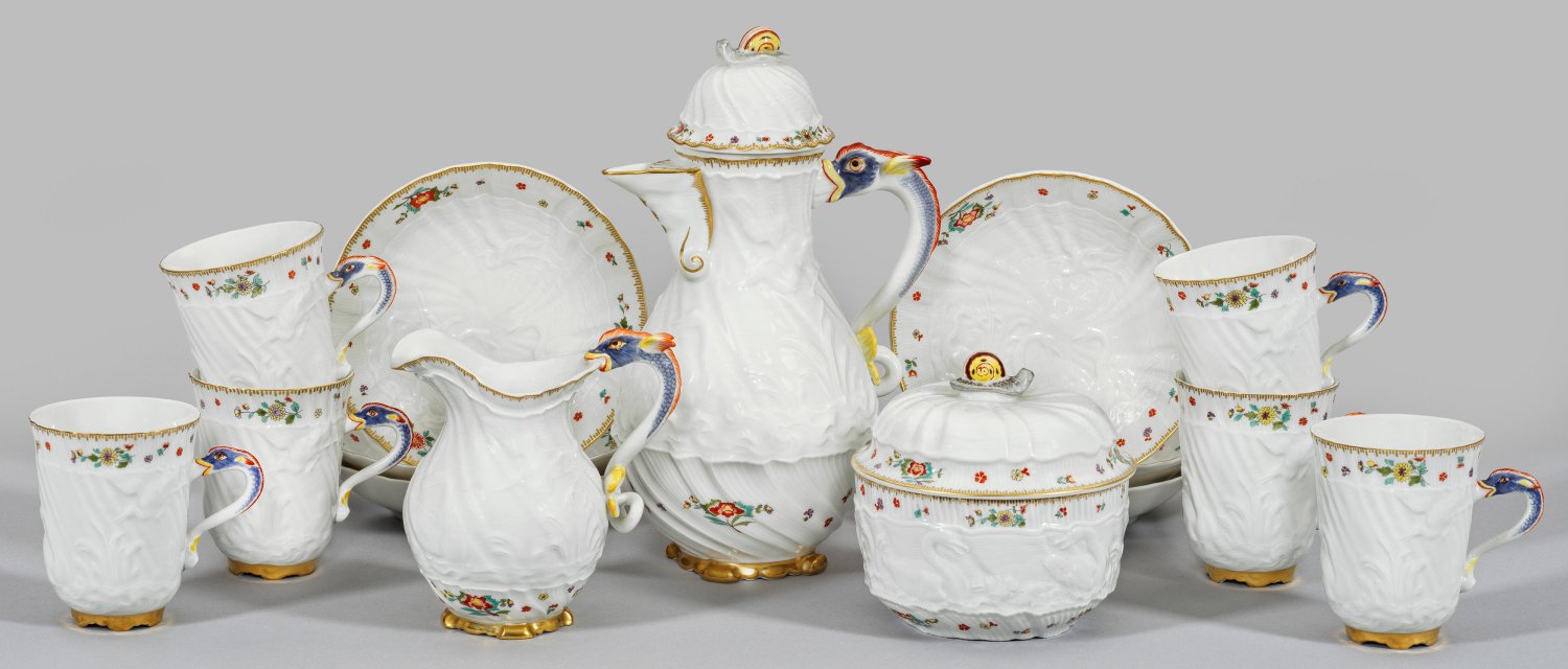 für sechs Personen. 9-tlg.; Schokoladenkanne, 6 Schokoladentassen mit Untertassen, Sahnegießer, Bonbonniere. Figürlicher Henkel und Knauf in Gestalt eines Delphins bzw. einer Schnecke. Feiner Reliefdekor aus zwei einander zugeneigten Schwänen, fliegendem und zwischen hohem Schilf stehendem Reiher. Indianischer Blütendekor in polychromer Malerei. Gekämmte Goldkante und -staffage. Entw. Johann Joachim Kaendler und Johann Friedrich Eberlein. Schwertermarke. Kannen-H. 25 cm.