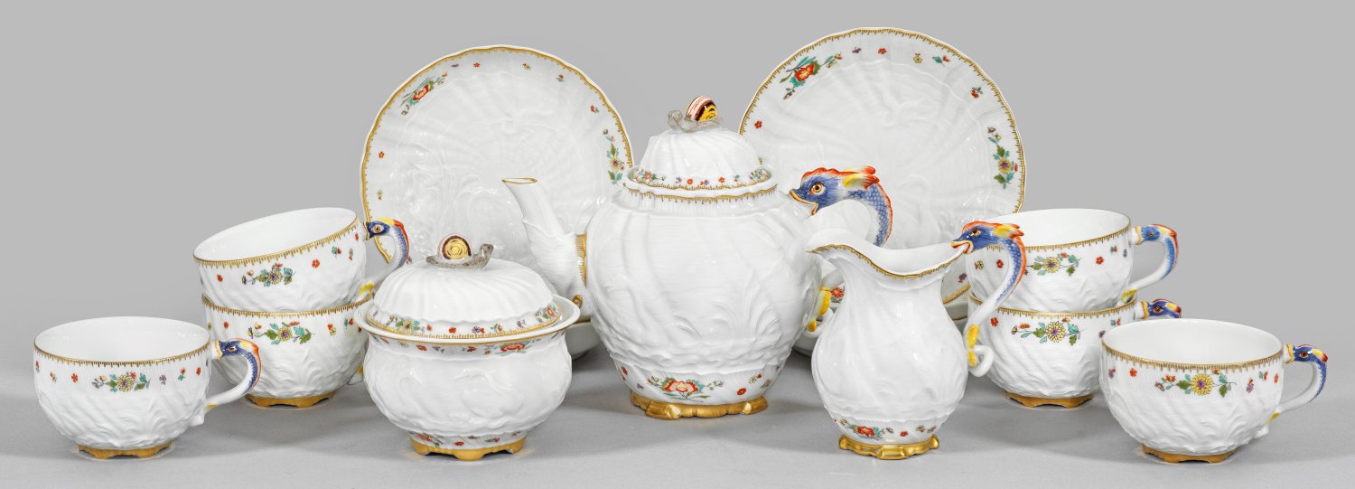 für sechs Personen. 9-tlg.; Teekanne, Sahnegießer, Zuckerdose, 6 Teetassen mit Untertassen. Figürlicher Henkel und Knauf in Gestalt eines Delphins bzw. einer Schnecke. Feiner Reliefdekor aus zwei einander zugeneigten Schwänen, fliegendem und zwischen hohem Schilf stehendem Reiher. Indianischer Blütendekor in polychromer Malerei. Gekämmte Goldkante und -staffage. Entw. Johann Joachim Kaendler und Johann Friedrich Eberlein. Kanne minim. best.; Schwertermarke. Kannen-H. 15 cm.