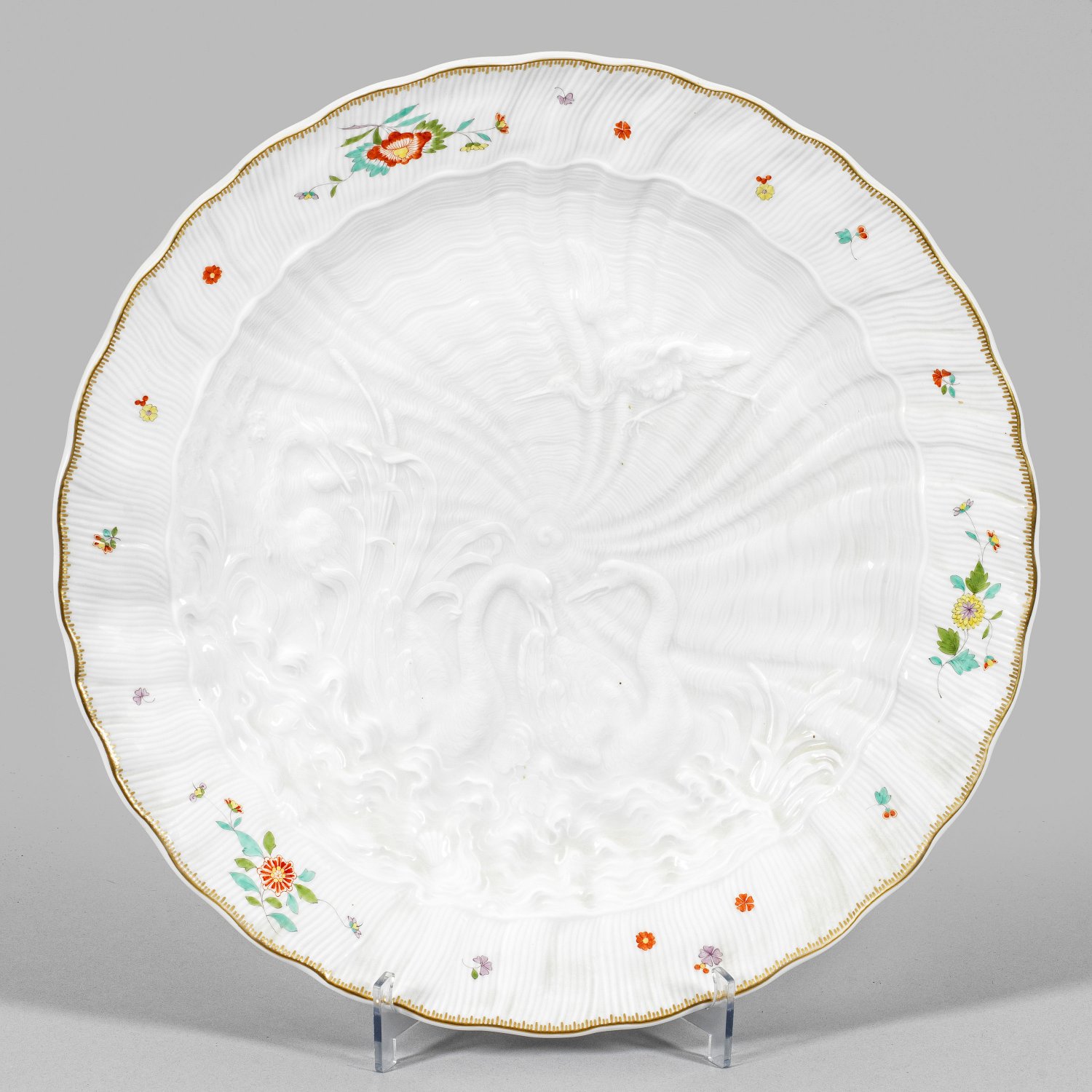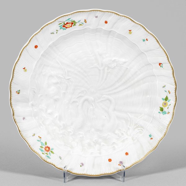 Runde, gemuldete Form. Im Spiegel feiner muschelförmiger Reliefdekor mit zwei einander zugeneigten Schwänen sowie fliegendem und zwischen hohem Schilf stehendem Reiher mit Indianischem Blütendekor in polychromer Malerei. Gekämmte Goldkante. Entw. Johann Joachim Kaendler und Johann Friedrich Eberlein. Schwertermarke. D. 35 cm.
