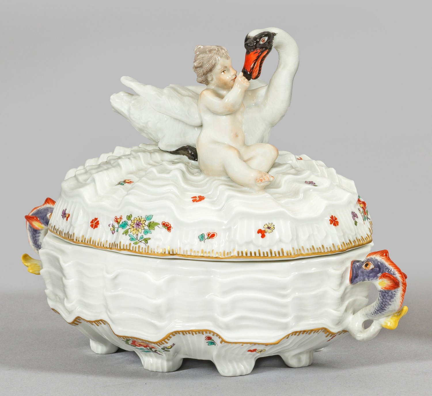 Von acht Füßen getragener, ovaler Korpus, seitlich gebogte Henkel in Form von Delphinen. Aufgewölbter Deckel, mittig vollplastisch gearbeiteter Knauf in Form eines Schwans mit reliefiertem Gefieder, der sich einem Putto zuwendet. Auf der Wandung und dem Deckel muschelförmiger, quer- und längsgerippter Reliefdekor mit farbigen Indianischen Blumenzweigen und gestreuten Blüten. Entw. nach Johann Friedrich Eberlein, 1739. Feine, polychrome Malerei mit gekämmter Goldkante. Schwertermarke. H. 12,5 cm, B. 18 cm.