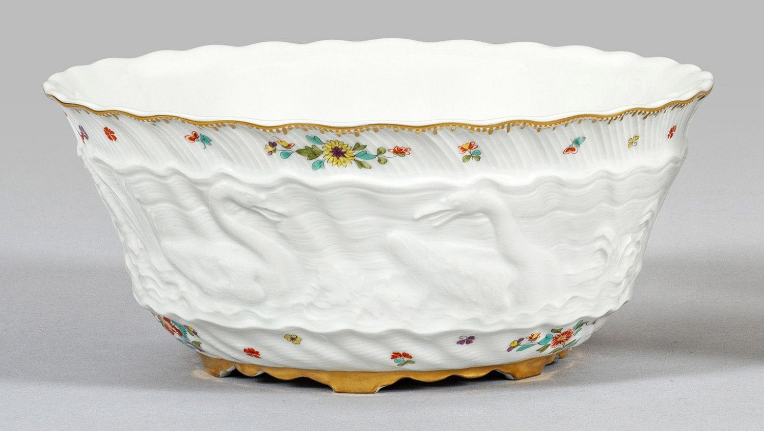 Runde Form. Feiner, muschelförmiger Reliefdekor aus dem Schwanenservice (Schwanendessin). Auf der Wandung zwei auf dem Wasser schwimmende, einander zugewandte Schwäne zwischen hohem Schilf sowie stehender und fliegender Reiher sowie asiatische Blütenzweige und gestreute Blumen in Kakiemon-Manier. Gekämmter Goldrand. Entw. Johann Joachim Kaendler und Johann Friedrich Eberlein. Schwertermarke. D. 19 cm.