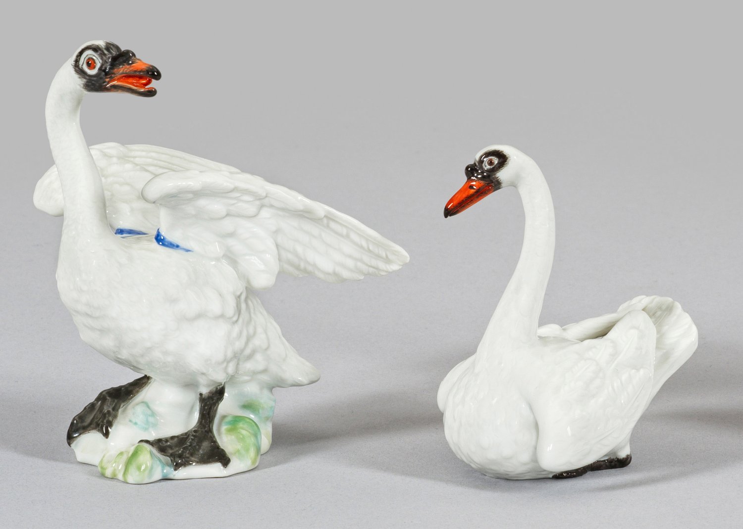 Naturalistische Darstellung eines schwimmenden Schwans und eines auf Natursockel stehenden Schwans mit gespreizten Flügeln und diese umschließenden Zügel mit goldener Öse. Polychrome Malerei. Entw. Johann Joachim Kaendler. Modell-Nr. 77156 und 77192. Schwertermarke. H. 7,5 cm - 10,5 cm.
