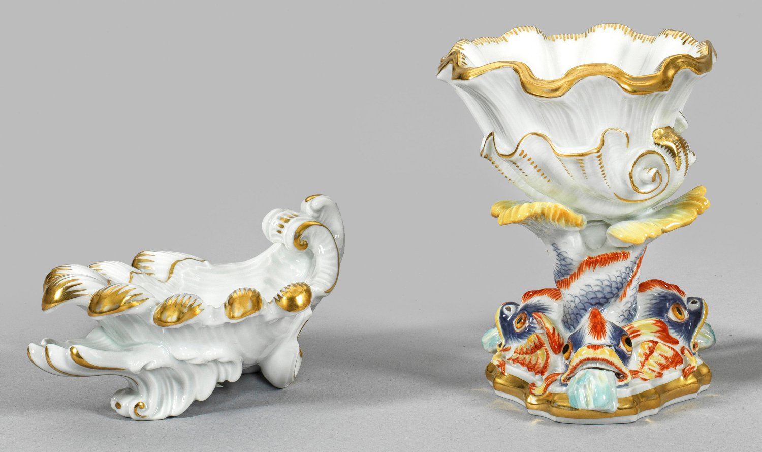 Muschelförmige Schale auf dreipassigem Fuß mit wasserspeienden Delphinen. Stark rocaillierte, gemuldete Schale als Muschel gestaltet. Im Spiegel eine Muschel. Reliefplastischer Dekor. Polychrome Malerei mit Goldstaffage. Entw. Johann Joachim Kaendler. Becher mit Modell-Nr. 80544. Schale aus Sammler Edition 2013/2014. Schwertermarke. H. 11 cm. L. bis 11,5 cm.