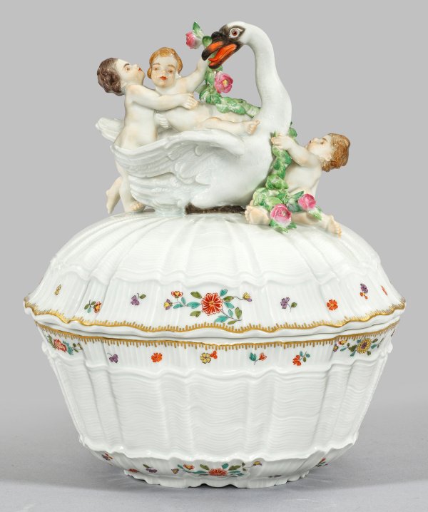 Von kurzen Füßen getragener, ovaler Korpus. Aufgewölbter Deckel, als Bekrönung vollplastisch gearbeitete Gruppe aus Putten, einen Schwan mit einer plastischen Blumengirlande schmückend. Auf der Wandung und dem Deckel muschelförmiger, quer- und längsgerippter Reliefdekor aus dem sog. Schwanenservice (Schwanendessin) mit farbigen Indianischen Blumenzweigen und gestreuten Blüten. Entw. Johann Friedrich Eberlein und Johann Joachim Kaendler, um 1739. Feine, polychrome Malerei in Kakiemonfarben mit gekämmter Goldkante. Schwertermarke. H. 21 cm.