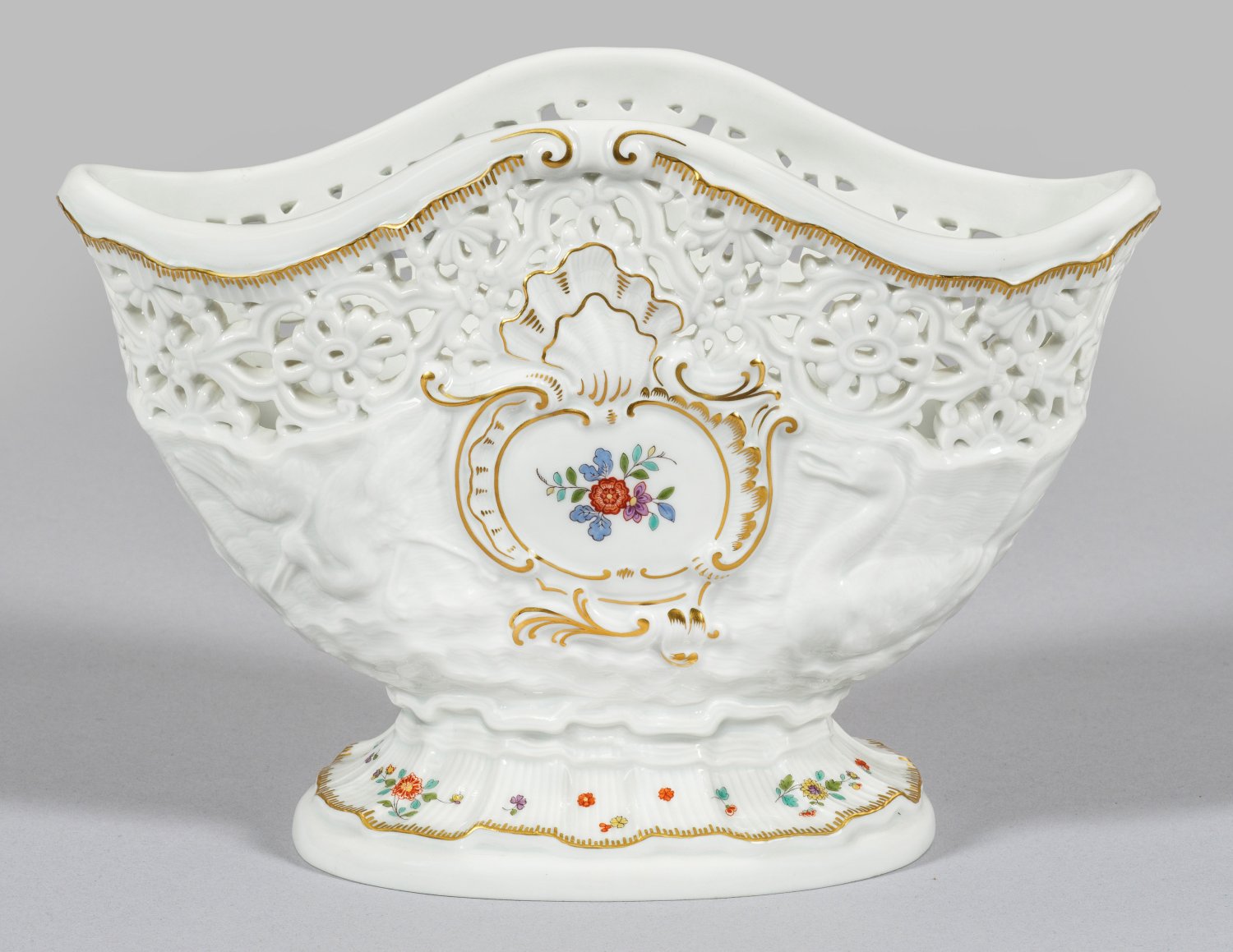 Ovaler, oberhalb floral durchbrochen gearbeiteter Korpus mit geschwungener Öffnung. Feiner Reliefdekor aus zwei einander zugeneigten Schwänen sowie fliegendem und zwischen hohem Schilf stehendem Reiher. Umlaufend farbiger Dekor aus Indianischen Blumenzweigen und gestreuten Blüten. Polychrome Malerei mit gekämmter Goldkante- und Staffage. Entw. Johann Friedrich Eberlein, 1741. Schwertermarke. H. 17,5 cm. L. 23,5 cm.