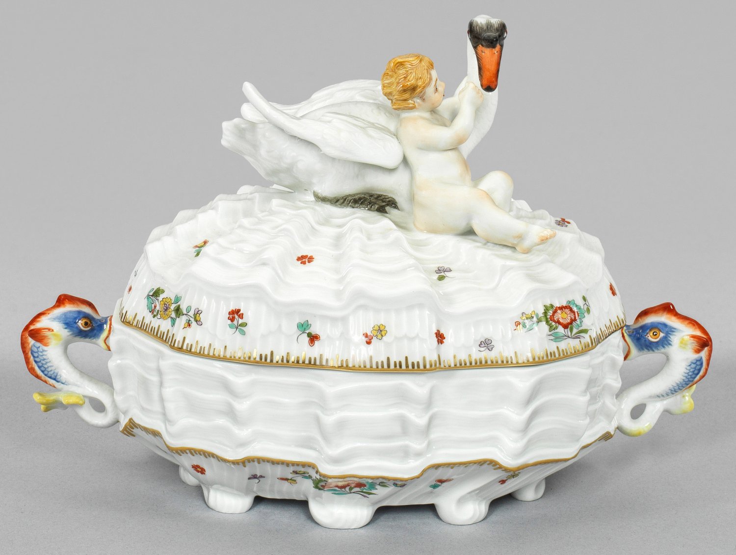 Von acht Füßen getragener, ovaler Korpus, seitlich gebogte Henkel in Form von Delphinen. Aufgewölbter Deckel, mittig vollplastisch gearbeiteter Knauf in Form eines Schwans mit reliefiertem Gefieder, der sich einem Putto zuwendet. Auf der Wandung und dem Deckel muschelförmiger, quer- und längsgerippter Reliefdekor mit farbigen Indianischen Blumenzweigen und gestreuten Blüten. Entw. nach Johann Friedrich Eberlein, 1739. Feine, polychrome Malerei mit gekämmter Goldkante. Schwertermarke. H. 12,5 cm. B. bis 18 cm.