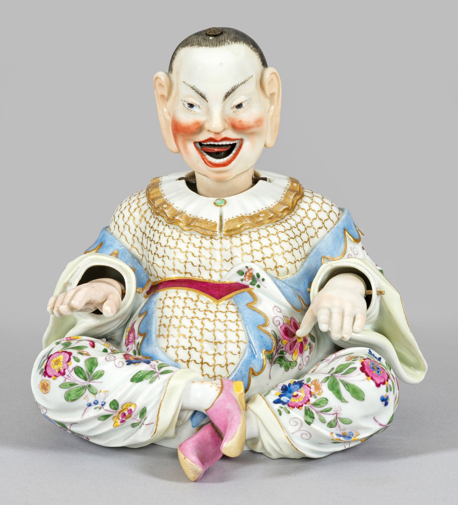 Mit verschränkten Beinen sitzender, dickbäuchiger Chinese in einem von großen Indianischen Blüten gemusterten Gewand mit hellblauem Innenfutter, purpurfarbenem Gürtel, spitzengesäumtem Kragen sowie rosafarbenen Pantoffeln. Der Oberkörper von einem Goldnetz bedeckt. Hände, Kopf und Zunge beweglich. Polychrome Malerei mit Goldstaffage. Entw. Johann Joachim Kaendler. Minim. rest./produktionsbed. Brandrisse. Schwertermarke. H. 18 cm.