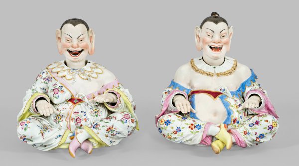 Mit verschränkten Beinen sitzende Chinesin bzw. Chinese in weißem, mit Indianischen Blüten gemustertem, unterhalb der Brust gegürtetem Gewand mit goldgesäumtem, ornamentiertem Spitzenkragen und gelb bzw. rosafarben staffierten Pantoffeln. Hände, Kopf und Zunge beweglich. Polychrome Malerei mit Goldstaffage. Entw. Johann Joachim Kaendler. Unw. rest./minim. best.; Schwertermarke. H. 29 cm - 33 cm.