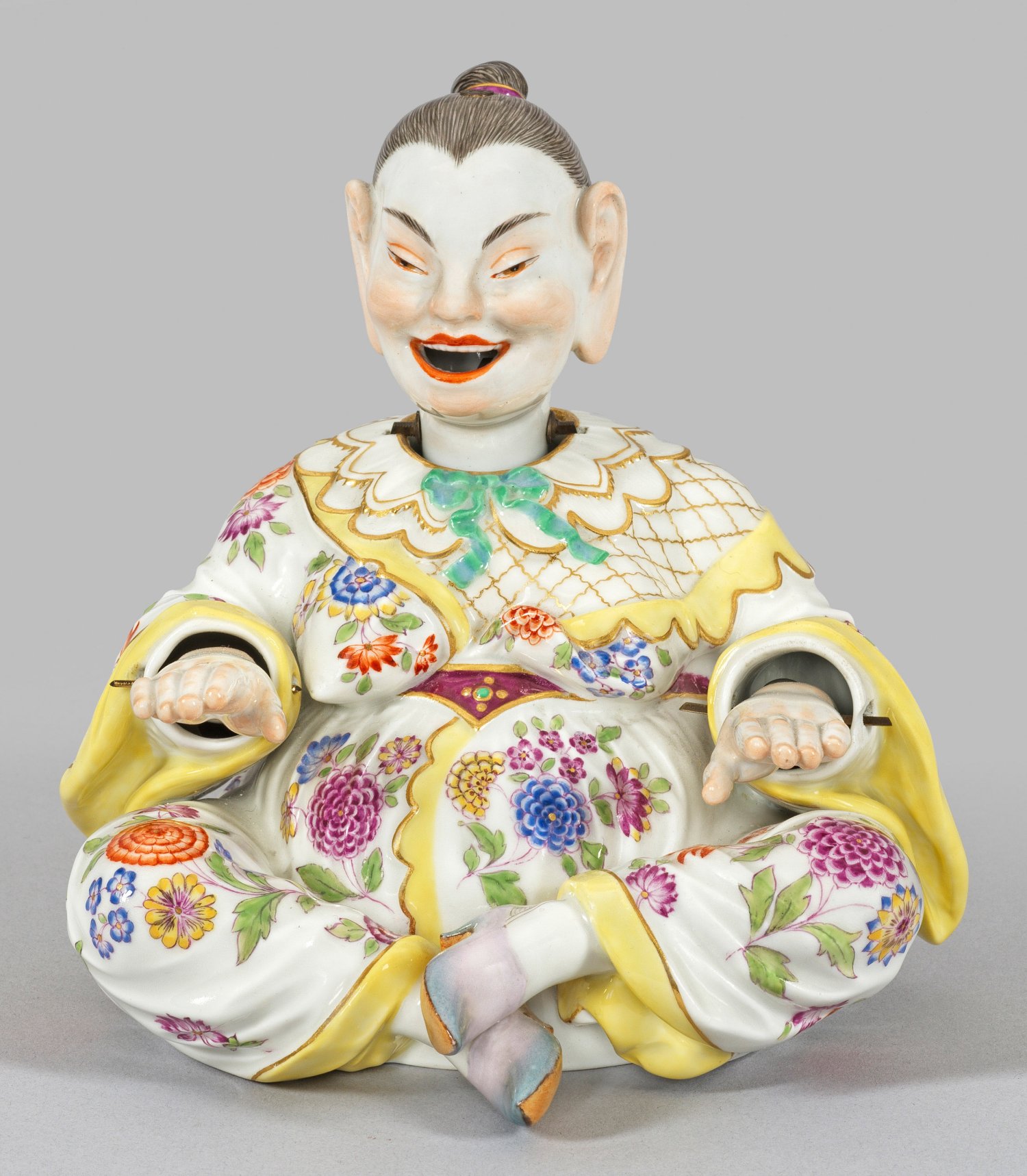 Mit verschränkten Beinen sitzende Chinesin in einem mit Indianischen Blumen gemustertem Gewand mit Spitzenkragen über goldenem Netzhemd und Schleife, dazu Pantoffeln und ein edelsteinbesetzter Gürtel. Das dunkle, fein gezeichnete Haar ist zu einem Zopf gebunden. Hände, Kopf und Zunge beweglich. Polychrome Malerei mit Goldstaffage. Entw. Johann Joachim Kaendler. Modell-Nr. 154. Schwertermarke. H. 16 cm.