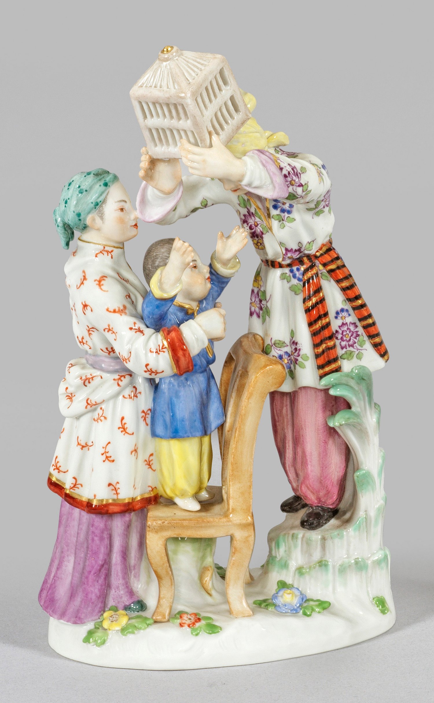 Japanergruppe (bzw. Chinesengruppe) mit Vogelkäfig. Auf einem Palmenstumpf erhöht stehende Chinesin, in ihren erhobenen Händen einen Vogelkäfig haltend. Vor ihr auf einem Stuhl stehendes, von einem älteren Mädchen gehaltenes Kind, mit emporstreckenden Armen nach dem Vogelbauer greifend. Polychrome Malerei mit Goldkonturierung. Entw. wohl Johann Joachim Kaendler oder Peter Reinicke. Modell-Nr. 65641. Schwertermarke. H. 16,5 cm.