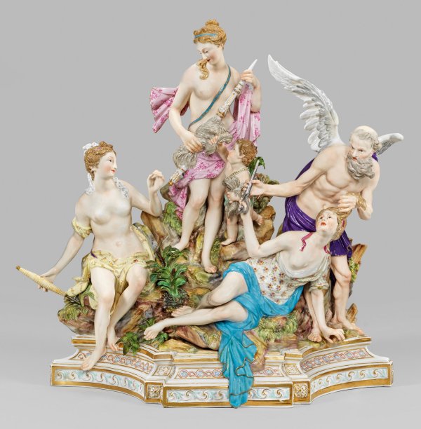 2-tlg., verschraubt. In der Front architektonischer, verkröpfter Sockel mit reliefierten Ornamentfriesen. Über Felsterrain komponierte Gruppe der drei römischen Schicksalsgöttinnen, der sog. Parzen. Mittig erhöht stehende, von einem Putto mit Wollbündel begleitete Clotho, zusammen mit der links sitzenden Lachesis, die Lebensfäden der Menschen spinnend. Rechts stehender Chronos, der Gott der Zeit, die vor ihm liegende Atropos an den Haaren zurückhaltend, um sie am Abschneiden des Fadens zu hindern. Polychrome Malerei mit reicher Goldstaffage. Entw. Johann Joachim Kaendler, 1774. Modell-Nr. 33. Unw. rest.; Schwertermarke. H. 37 cm. B. 35 cm.
