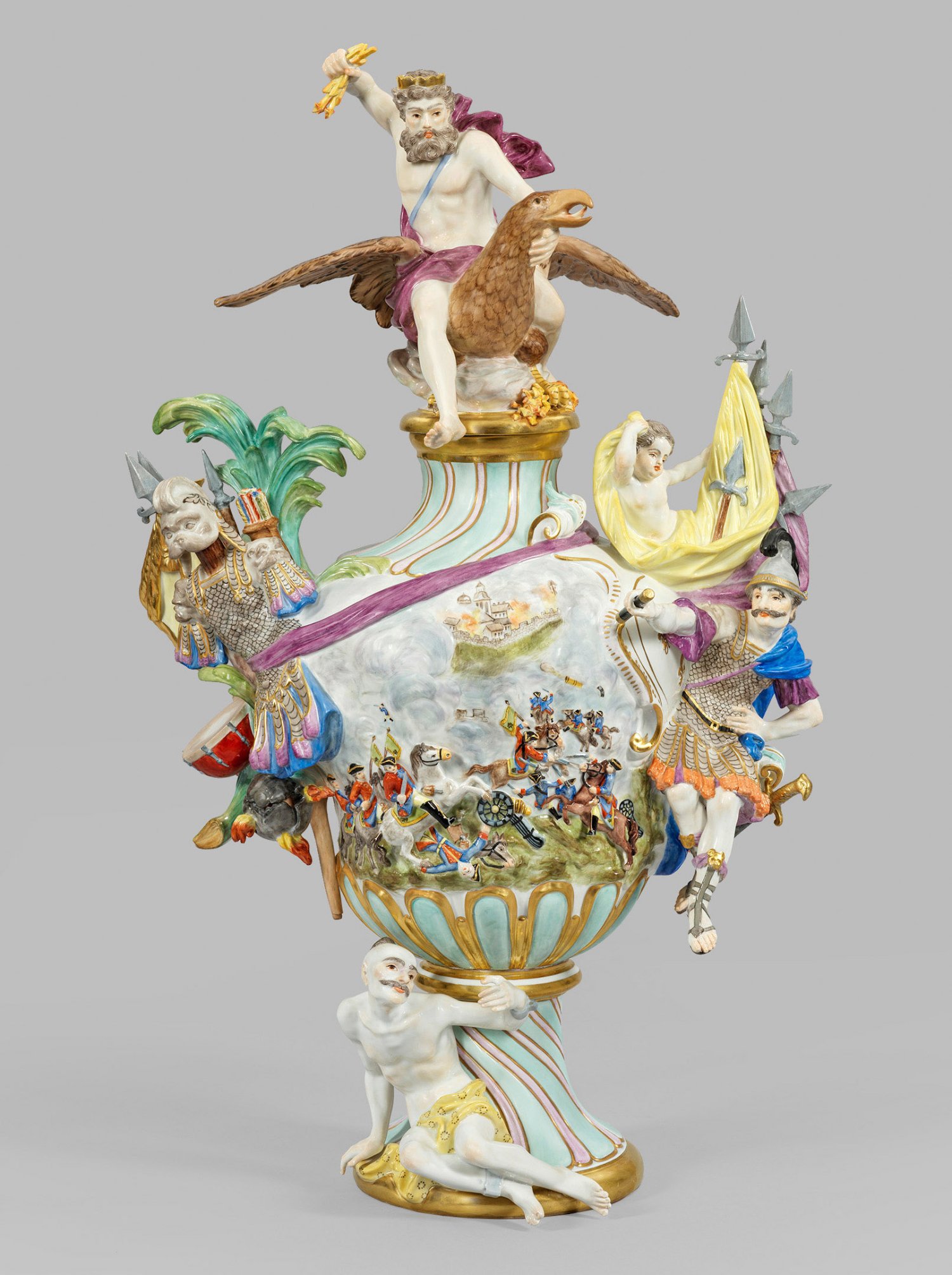 Über rundem Fuß gebauchter, mittig leicht eingeschnürter Korpus mit eingezogenem Hals und profiliertem Lippenrand, umzogen von verschiedenen Ornamentfriesen. Aufgewölbter Deckel, bekrönt von vollplastischer Darstellung des Göttervaters Jupiter mit Blitzbündel, auf einem Adler reitend. Auf der Schauseite reliefplastische, szenische Darstellung einer Schlacht des 18. Jhs.; Vor der Kulisse einer Ortschaft in Feuerbrunst, zwischen aufsteigenden Rauchwolken kämpfende Kavalleristen sowie gefallene Soldaten. Flankierend applizierter, plastischer Dekor mit Figur des behelmten Kriegsgottes Mars in römischem Harnisch zwischen Fahnen, Speeren und Feldtrommel, begleitet von einem Genius bzw. großer Kriegstrophäe aus Rüstung und Helm, umgeben von Fahnen, Feuerkugel und Trommeln als Symbole des Triumphes. Am Fuß sitzender, gefesselter Gefangener. Rücks., zwischen feinem Streublumendekor, reliefierte Kartuschenrahmung mit Inschrift "DIEU ET MON DROIT" ("Gott und mein Recht") auf mattblauem Fond, Maxime der englischen Krone, die auf die Regierungszeit Heinrich VI. (1422 - 1461) zurückgeht, der sowohl zum König von England als auch zum König von Frankreich gekrönt wurde. Umlaufend Ornamentbordüren. Polychrome Malerei mit reicher Goldstaffage. Entw. Johann Joachim Kaendler. Rest.; Unterglasurblaue Eigentumsmarke FA in Ligatur mit Krone und Nr. 10. Schwertermarke. H. 65 cm.