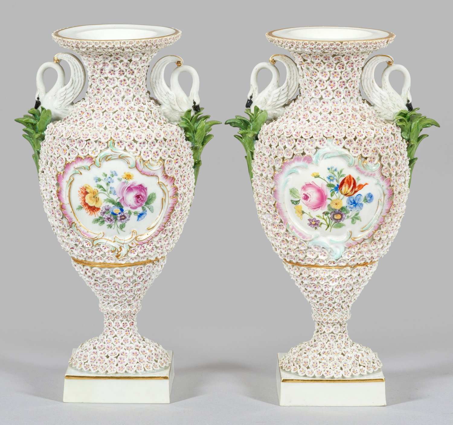 Lot 807: Paar prächtige Meissen Schneeballenvasen mit Schwanenhenkel