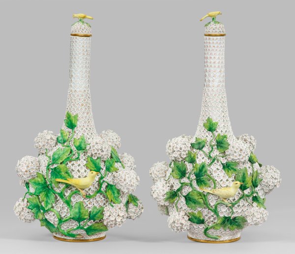 An exceptional pair of porcelain "Schneeballen" vases with canaries. Insignificantly chipped/restored. Crossed swords mark.
