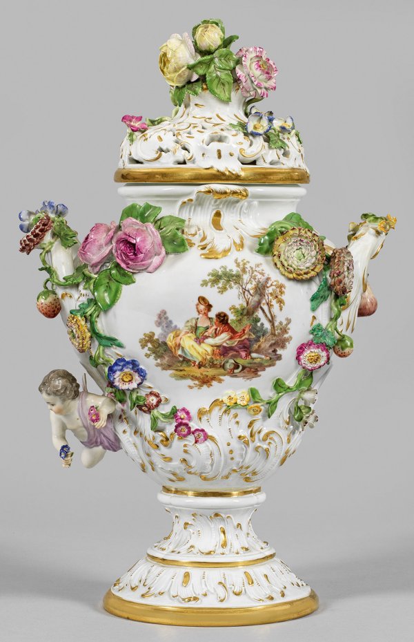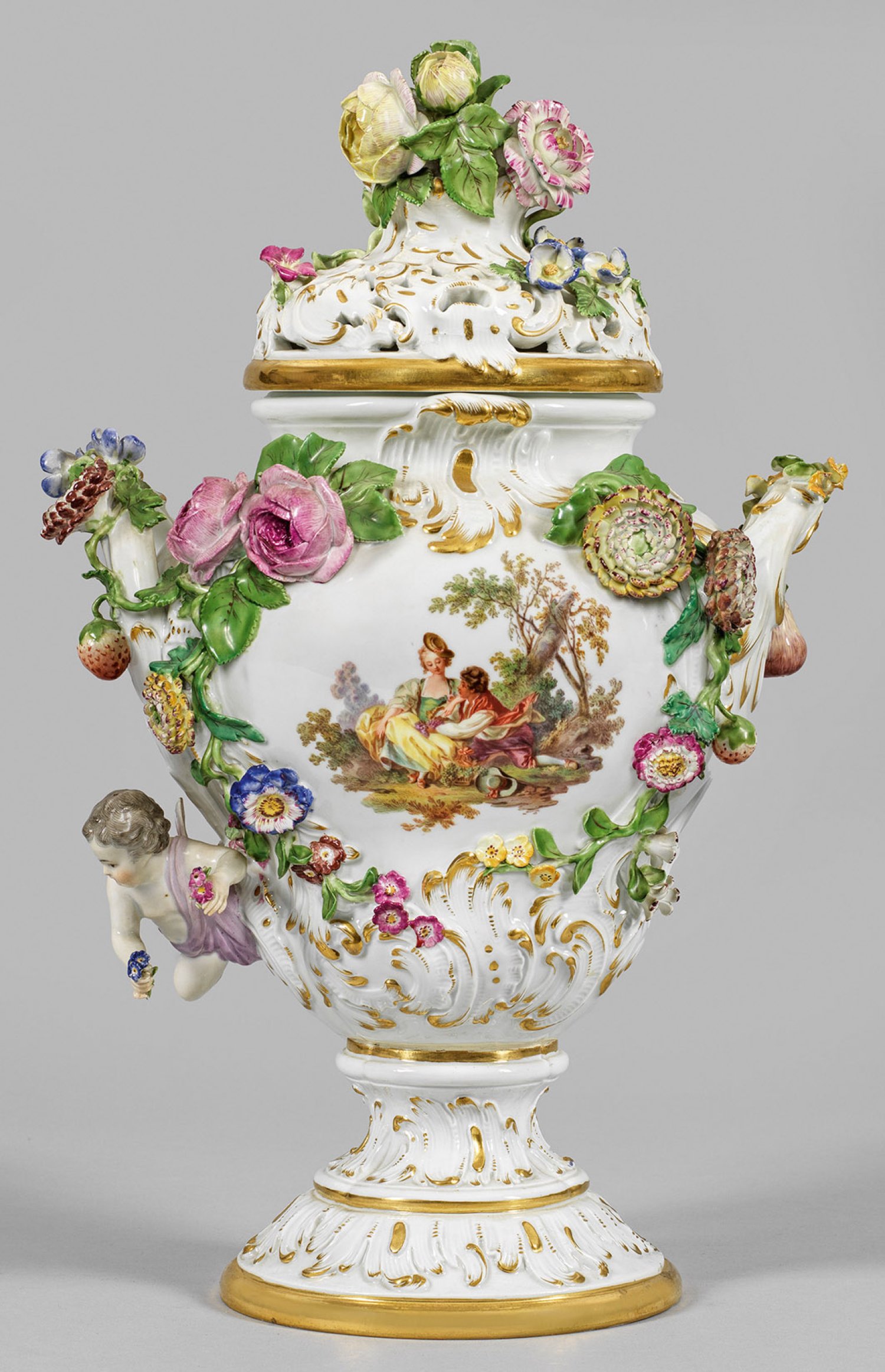 Über mehrfach gegliedertem Rundfuß balusterförmiger Korpus mit Blattreliefdekor. Seitlich blattförmig reliefierte Handhaben. Durchbrochen gearbeiteter Deckel mit Blumenbekrönung. Beidseitig der Wandung, von plastisch aufgelegten Blumen- und Früchteranken umzogene Watteauszene bzw. Blumenbukett. Unterhalb schwebender Putto mit Blumensträußen. Feine polychrome Malerei mit reicher Goldstaffage. Entw. Johann Joachim Kaendler. Modell-Nr. 2719. Teilw. rest.; Bekrönung besch.; Schwertermarke. H. 44 cm.