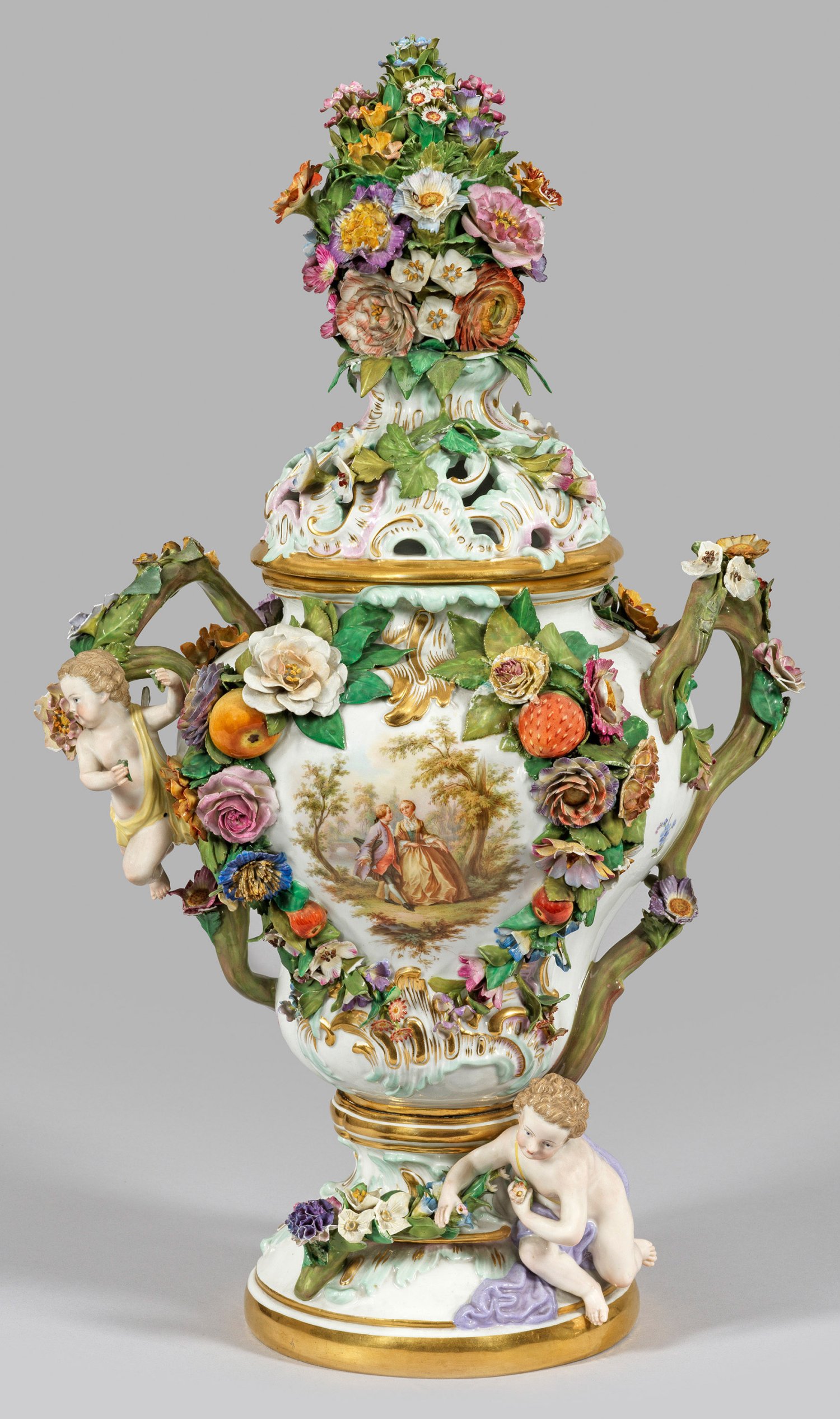 Über getrepptem, rocaillereliefiertem Rundfuß balusterförmiger, stark vorwölbender Vasenkorpus mit gerundeter Schulter und profiliertem Rand. Gehöhter, von Rocaillereliefs umzogener, durchbrochen gearbeiteter Deckel, in reliefplastische Blätter übergehend, als Basis für ein prächtiges Blumenbukett aus verschiedenen, feinplastisch modellierten, geöffneten Blüten. Seitlich reliefplastisch aufsteigende Blumenranken als Handhaben. Feinplastisch modellierter, aufgelegter Dekor mit üppigen Festonen aus sommerlichen Blüten und Früchten. Unter- und oberhalb sitzende Amorette mit Girlande. Kartuschenhafte Rahmung mit der Darstellung eines galanten Paares nach Watteau und Blumenbuketts. Feine polychrome Malerei mit reicher Goldstaffage. Entw. Johann Joachim Kaendler. Modell-Nr: 2745. Best.; Rest.; Schwertermarke. Ges.-H. 64 cm.