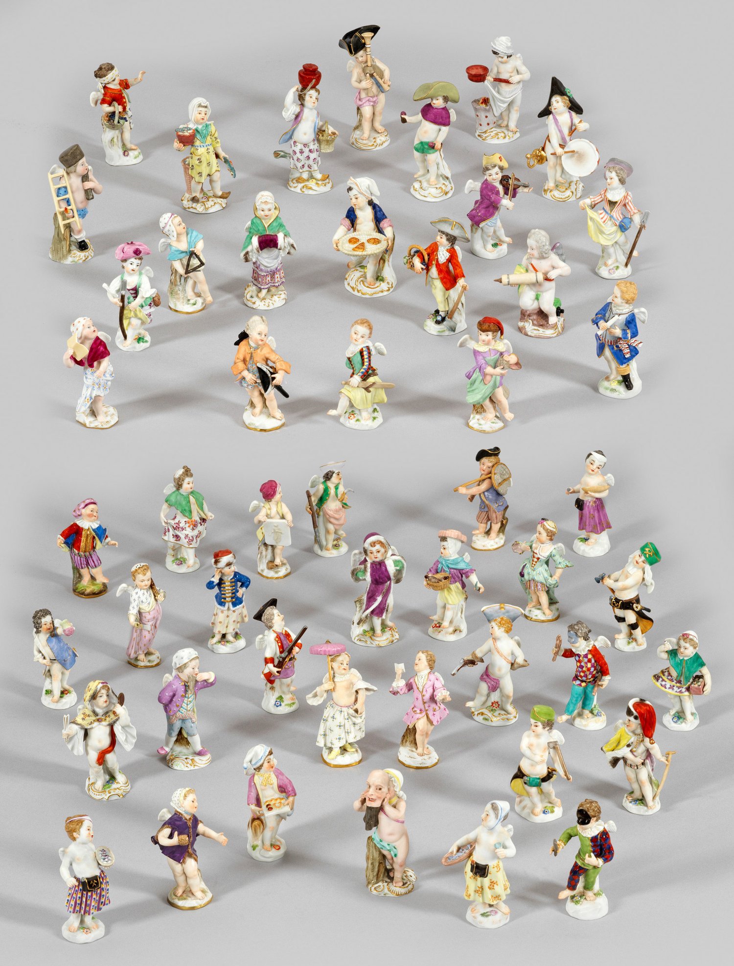 50-tlg.; Auf rocaillereliefiertem Sockel stehende Amorettenknaben und -mädchen, verkleidet u. a. als Harlekinette, Husar, Bäcker, Bildhauer, Bergmannsknabe, Bergmannsmädchen, Schornsteinfeger, Winzer, Hanswurst, Fischverkäuferin, mit Maske, Geige und Spiegel. Polychrome Malerei mit Goldstaffage. Entw. Michel Victor Acier, um 1775. Teilw. unw. rest.; Schwertermarke. H. 8,5 cm - 11 cm.